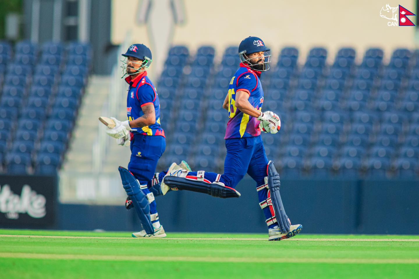 नेपालका लागि भीम सार्कीले सर्वाधिक ७३ रनको योगदान दिए । उनले ८५ बलमा ८ चौकाको सहयोगमा ७३ रनको अर्धशतकीय इनिङ खेलेका हुन् । भीमले आरिफ शेखसँग मिलेर ९४ रनको साझेदारी गरे । शेख ५५ बलमा ५ चौकाको सहयोगमा ३९ रनमा आउट भए ।