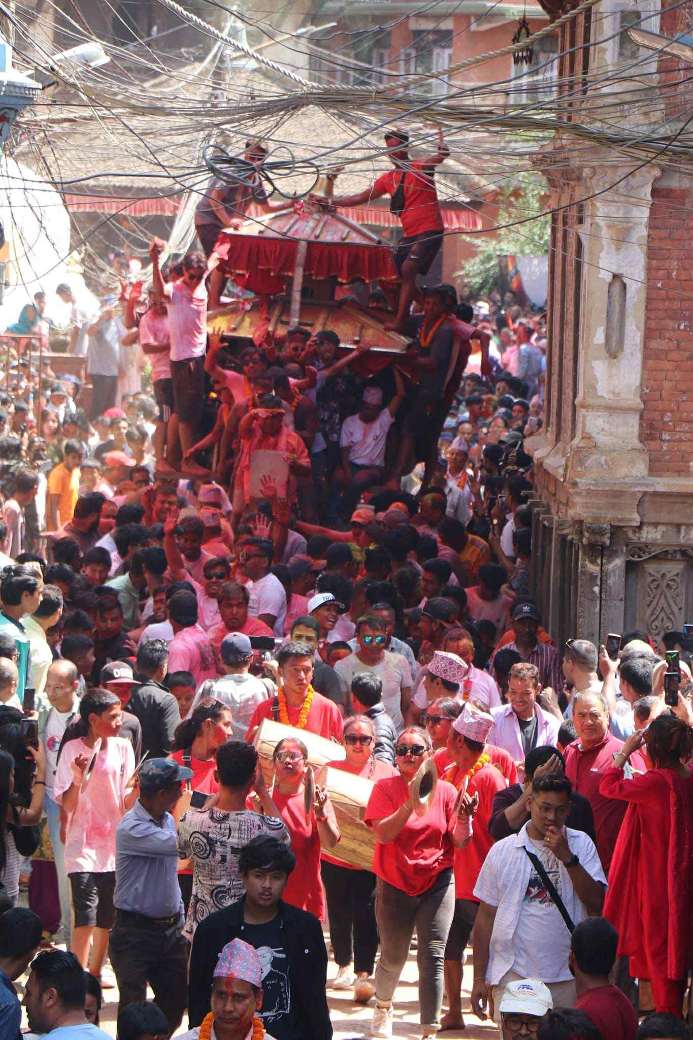 लाम् पाटीमा रहेको भैरवको रथलाई तानेर ल्याई पुलिस पाटीनजिकै रहेको भद्रकालीको रथसग जुधाइन्छ । रथ जुधाउने बेलामा दुवै रथमा सवार रहेका मानिसहरू एक–आपसमा अबिर छर्केर हर्ष व्यक्त गर्दछन् । यो कार्य सकिएपछि भैरवको रथलाई फर्काएर नवदुर्गा डबलीभन्दा केही पर राखिन्छ । उन्मत्तभैरवको रथ गन्तव्य स्थानमा पुगेपछि भद्रकालीको रथ तानेर ल्याई भैरवको रथ“ग पछाडिबाट जुधाइन्छ । एवं प्रकारले भैरव र भद्रकालीको रथ तीन–तीन पटक एक–आपसमा जुधाइसकेपछि इन्द्रेश्वर महादेवको रथ भद्रकालीको रथ“ग अगाडिबाट तीन चोटि जुधाइन्छ । रथ जुधाउन“दा अबिर एक–आपसमा छर्केर हर्ष व्यक्त गर्ने चलन छ । रथ जुधाउने जात्रा हेर्नको लागि टाढा टाढाबाट मानिसहरू आउने गरेका छन् ।