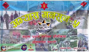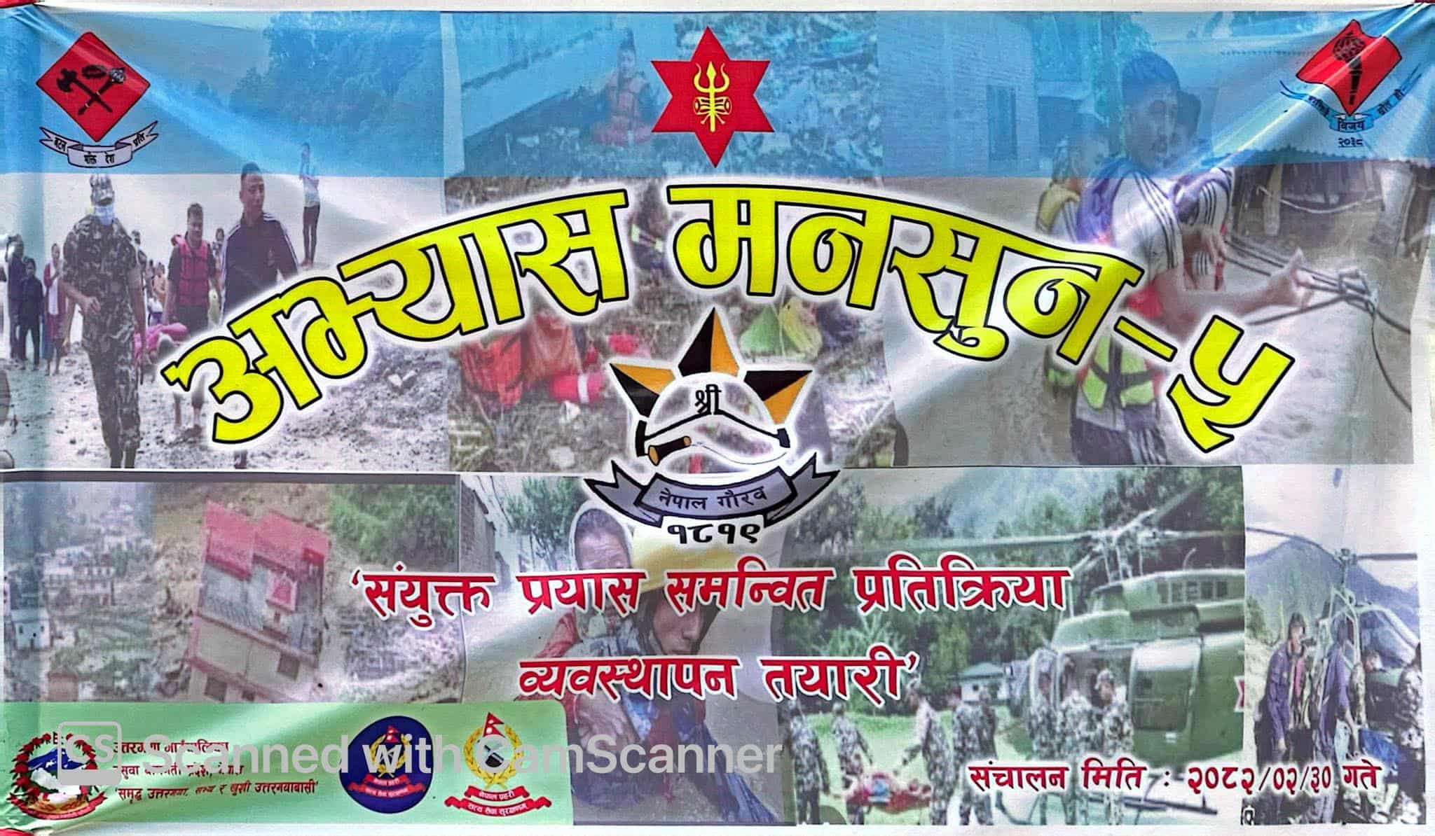 मनसुन नजिकिँदै जाँदा नेपाली सेनाले विपद्का बेला गरिने उद्धार तथा क्षति न्यूनीकरण सम्बन्धी नमुना अभ्यास सरोकारवाला र स्थानीयमाझ “अभ्यास मनसुन पाँच प्रस्तुत गरेको बताएको छ । बाढी, पहिरो, डुबानबाट प्रभावितहरूको स्थिति हेरी नागरिकको उद्धार घाइतेहरूलाई प्राथमिक उपचारका लागि सुरक्षित स्थानमा राख्ने, अशक्त भएकालाई प्राथमिक उपचार सँगै चाँडो सुविधा सम्पन्न अस्पतालमा एम्बुलेन्स मार्फत लैजाने लगायतका डेमो प्रदर्शन गरिएको नेपाली सेनाका श्री नाथगणका गणपति प्रधुन्न गौतमले बताउनुभयो ।