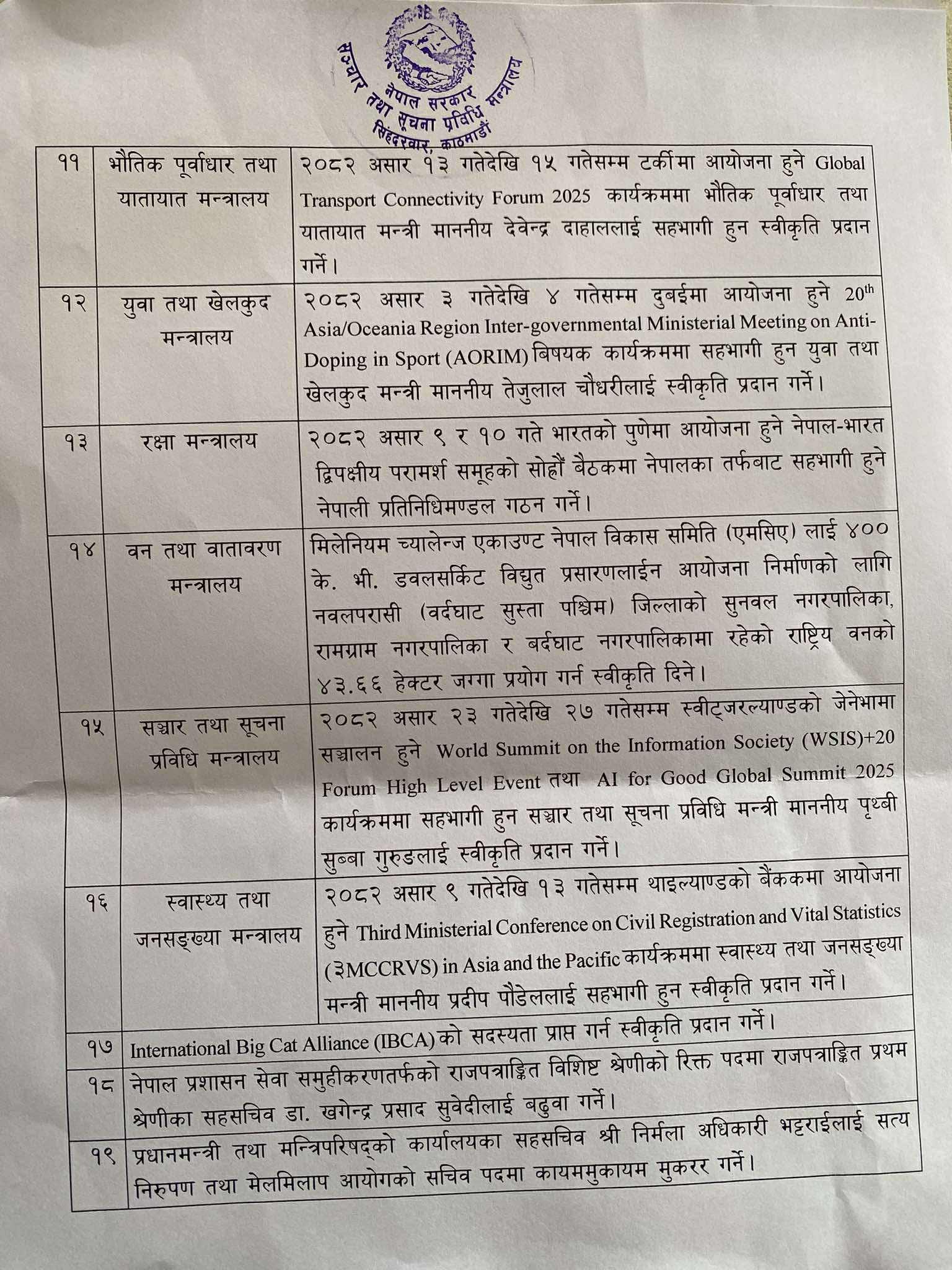 यस्तै बेठकले भौतिक पूर्वाधार मन्त्री, संचार तथा सुचना प्रविधि मन्त्री, युवा तथा खेलकुद मन्त्री र स्वाथ्य तथा जनसंख्या मन्त्रीहरुको विदेश भ्रमणलाई स्वीकृति प्रदान गरेको छ ।