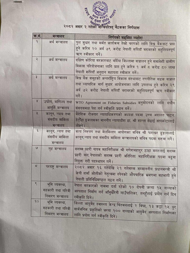 विश्व बैँकबाट २० अर्ब ७९ कराेड रुपियाँ बराबरकाे सहुलियतपूर्ण ऋण स्वीकार गर्ने निर्णय; विभिन्न चार जना मन्त्रीलाई विदेश भ्रमणको स्वीकृति प्रदान