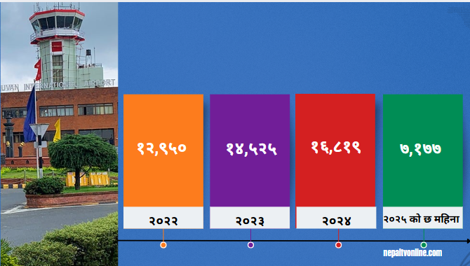 २०२५ जनावरी यता मात्र गएको छ महिनामा ७ हजार १ सय ७७ जना भारतीय नागरिकले तेस्रो मुलुक जानका लागि नेपालको त्रिभुवन विमान स्थल प्रयोग गरेको छन ।