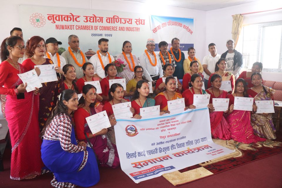 बागमती प्रदेश सरकार, सामाजिक विकास मन्त्रालय, प्रदेश प्राविधिक तथा व्यावसायिक शिक्षा एवम् तालिम परिषद्, हेटौँडा, मकवानपुर र विदुर नगरपालिकाको आर्थिक सहयोगमा महिलाहरूका लागि सञ्चालित सिलाई कटाई सम्बन्धी निःशुल्क सीप विकास कार्यक्रम सम्पन्न भएको छ । कुल ३ सय ९० घण्टाको उक्त सिपमूलक कार्यक्रममा सहभागीहरुलाई प्रमाण पत्र वितरण गर्दै विदुर नपाका मेयर राजन श्रेष्ठले समापन गर्नुभयो ।