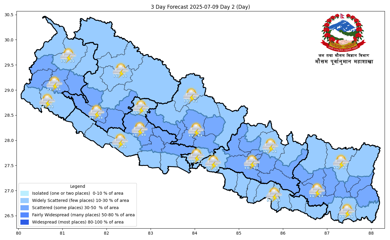 गण्डकी, कर्णाली र सुदूरपश्चिम प्रदेशको एकदुई स्थानमा भारी वर्षाको सम्भावना छ । साथै उच्चपहाडी तथा हिमाली भागका केही स्थानमा हल्कादेखि मध्यम वर्षा र हिमपातको सम्भावना छ ।