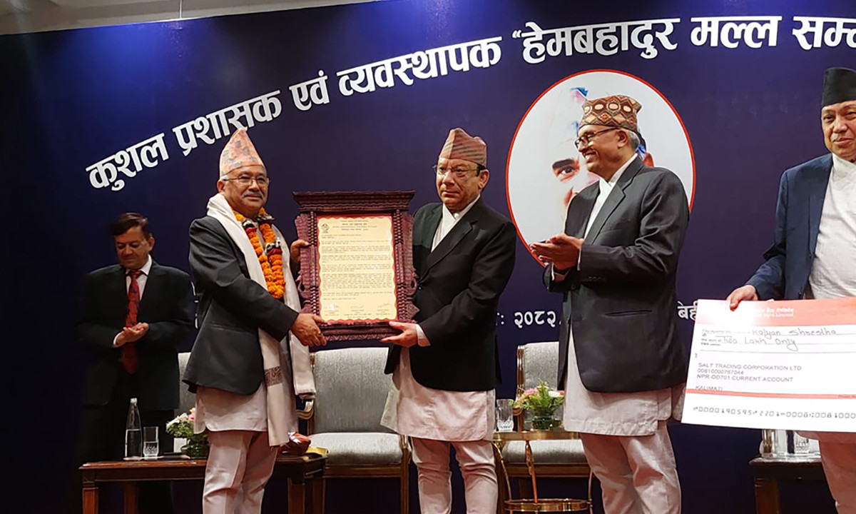 काठमाडौँ- साल्टट्रेडिङ कर्पोरेसनका संस्थापक स्व हेमबहादुर मल्लको सम्मानमा स्थापना गरिएको ‘हेमबहादुर मल्ल सम्मान २०८०’ पूर्वप्रधानन्यायाधीश कल्याण श्रेष्ठलाई प्रदान गरिएको छ । नेपाल जनप्रशासन सङ्घ र कर्पोरेशनले संयुक्त रुपमा आज आयोजना गरेको कार्यक्रममा प्रधानन्यायाधीश प्रकाशमानसिंह राउतले उहाँलाई सो सम्मान प्रदान गरेको हो ।