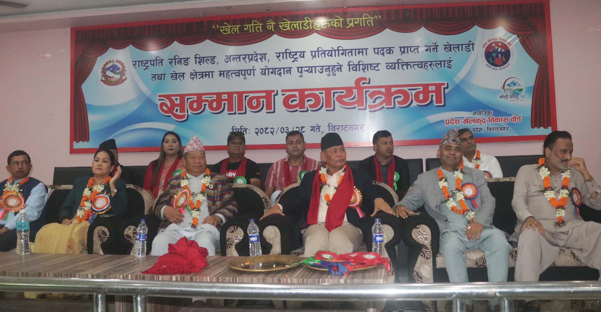 कोशी प्रदेश खेलकुद विकास बोर्डद्वारा आज विराटनगरमा आयोजित राष्ट्रपति रनिङ, अन्तरप्रदेश, राष्ट्रिय प्रतियोगितामा पदक प्राप्त गर्ने खेलाडी तथा खेलक्षेत्रमा महत्त्वपूर्ण योगदान पुर्याउने व्यक्तिहरुलाई सम्मान गर्दै खेलाडी खेलमार्फत आयर्जन गर्न सक्षम बन्नु सुखद विषय भएको बताउनुभयो ।