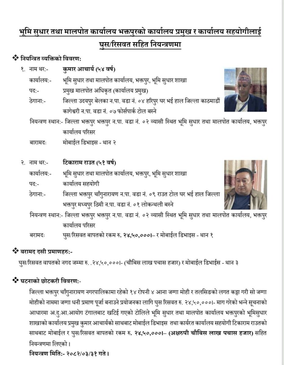 भक्तपुर चाँगुनारायण नगरपालिकामा रहेको १४ रोपनी चार आना जग्गा मोही र तलसिङको लगत कट्टा गरी सो जग्गा मोहीको नाममा जग्गाधनी प्रमाणपुर्जा बनाउने प्रयोजनार्थ २४ लाख ५० हजार रुपैयाँ घुस माग गरेको उजुरीका आधारमा नियन्त्रणमा लिइएको अख्तियार दुरुपयोग अनुसन्धान आयोगका प्रवक्ता राजेन्द्रकुमार पौडेलले जानकारी दिनुभयो ।