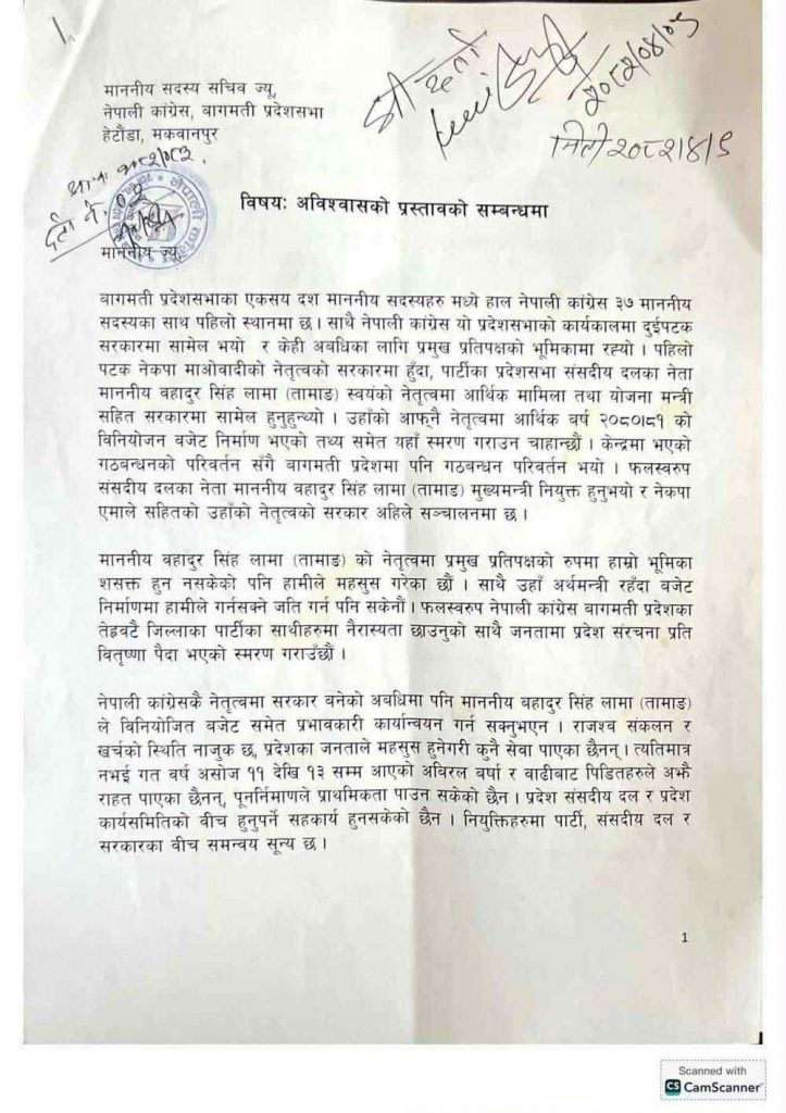 संसदीय दलका सचिब कृष्ण तामाङलाई २१ जना सांसदहरुको हस्ताक्षर सहितको अविश्वासको प्रस्ताब बुझाएका हुन। संसदीय दलका नेता बहादुर सिंह लामा तामाङले सर्वसाधारणको अपेक्षा अनुसार काम गर्न नसकेको निष्कर्ष सहित आज दिउसो मात्र काग्रेसबाट सुरकारमा गएका ४ जना मन्त्रीले राजीनामा दिएका थिए ।