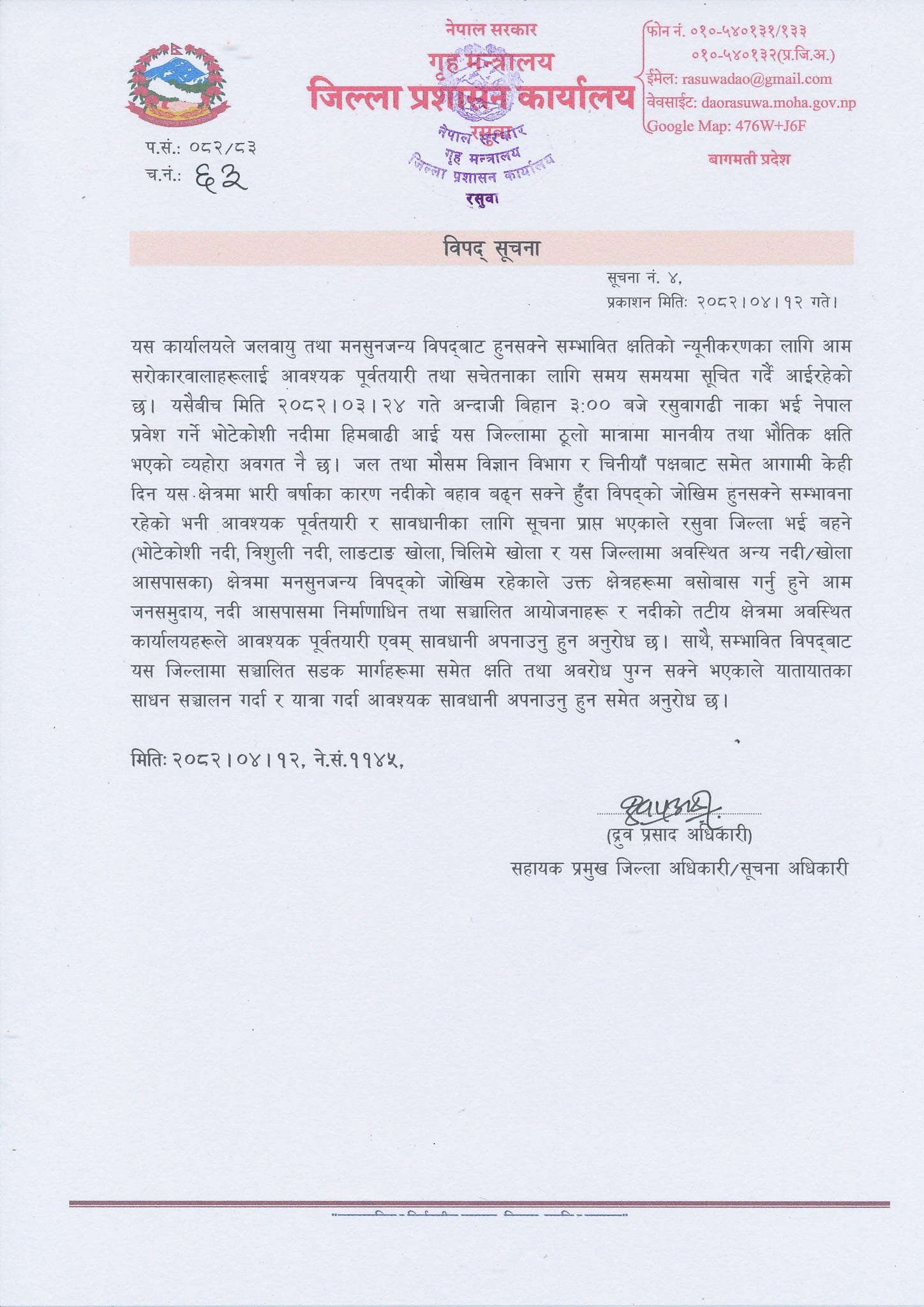 यहि असार चौबीस गते मङ्गलबार आएको बाढीले जनधनको क्षति गरी सकेकाले पूर्वतयारीमा रहि घटना हुन भन्दा अगावै सचेत रहन तथा बिपतका घटना घटेमा तत्काल जिल्ला प्रशाशन कार्यालय रसुवामा खबर गर्न समेत प्रमुख जिल्ला अधिकारी अर्जुन पौडेलले सबैमा अनुरोध गर्नुभएको छ ।