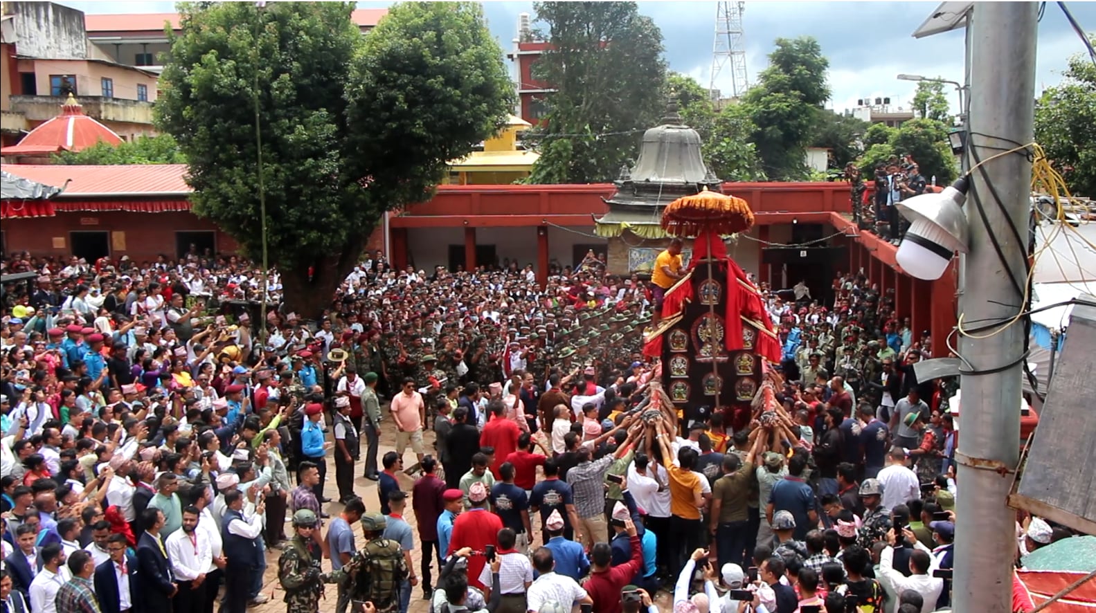 भगवतीको रथलाई दुवैतिर तेर्साइएका बलिया नोलहरूलाई काँधमा बोकी जय जयकारको गुन्जन ध्वनिमा नेपाली सेनाको हर्ष बढाइँका साथ नगर परिक्रमा गर्ने पुरानो प्रचलन रहिआएको छ ।
