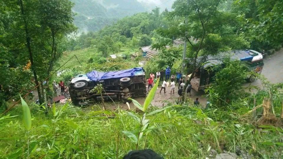 बाटो अवरुद्ध भएपछि साना गाडी भित्तो खोलेर पास गराइएका छन् । मालबाहक ट्रक माथिल्लो बाटोबाट पल्टिएर तल्लो बाटोमा आधा भागमा अडिएको छ ।