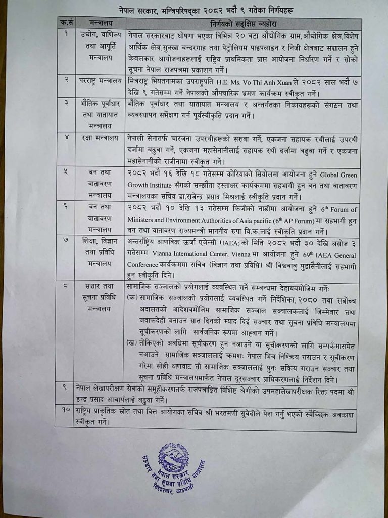 यस्ता छन् मन्त्रिपरिषद् बैठकका १० निर्णयहरु :