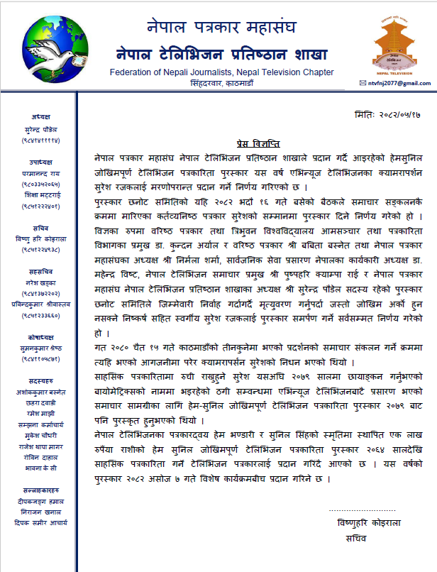 हेमसुनिल जोखिमपूर्ण टेलिभिजन पत्रकारिता पुरस्कार स्वर्गीय पत्रकार रजकलाई