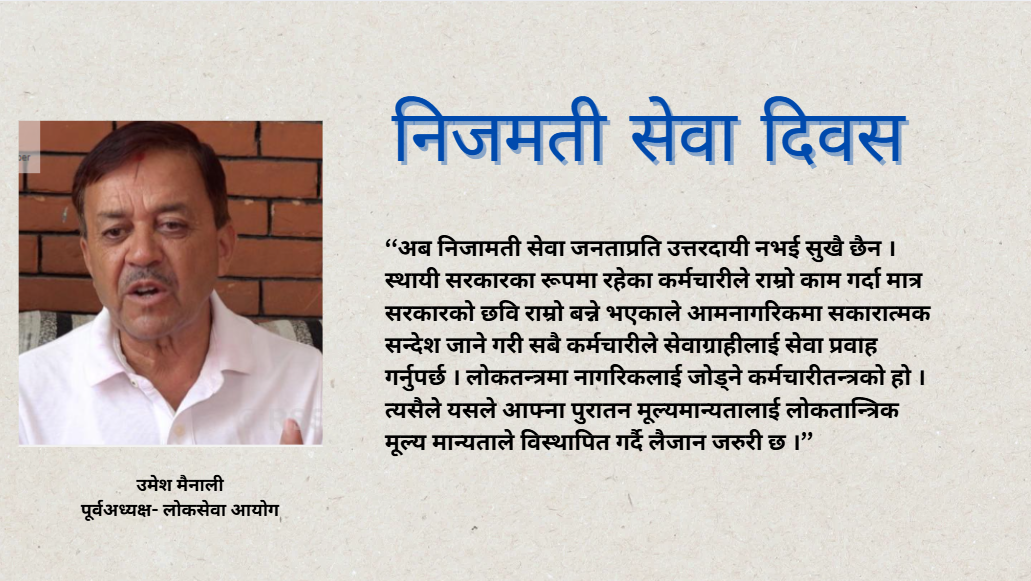 कर्मचारीले जनप्रतिनिधिको निर्णयलाई अवज्ञा गर्न मिल्दैन । पछिल्लो समय संसद्ले गरेका निर्णयहरुमा उच्चपदस्थ कर्मचारीहरुको असन्तुष्टि भन्ने कुराले छवि धमिल्याएको छ । जनप्रतिनिधि पनि कर्मचारीको इशारामा चल्नु हुँदैन । कर्मचारीले जनप्रतिनिधि प्रभावित तुल्याई आफ्नो एजेण्डा स्थापित गराउन खोज्नु हुँदैन । निजामती सेवाको तीनवटा भूमिका हुन्छ । त्यो हो सरकारले बनाएका नीतिहरुको कार्यान्वयन गर्नु, राजनीतिज्ञलाई तटस्थ सल्लाह दिनु र अप्ठ्यारो परेको अवस्थामा सरकार सञ्चालन गर्नु । त्यसभन्दा बाहिरको भूमिका खोज्नु हुँदैन । कर्मचारीतन्त्रप्रति विश्वास दिलाउन निजामती सेवा दिवसले प्रेरणा देओस् । (प्रस्तुत विचार लोक सेवा आयोगका पूर्वअध्यक्ष तथा नेपाल सरकारका पूर्वसचिव मैनालीसँग गरिएको कुराकानीमा आधारित)