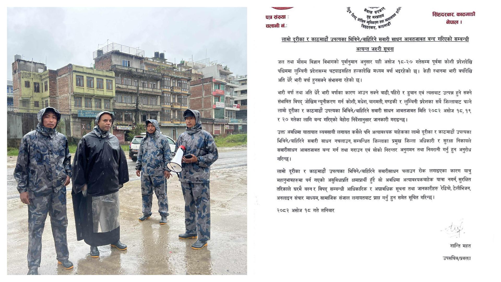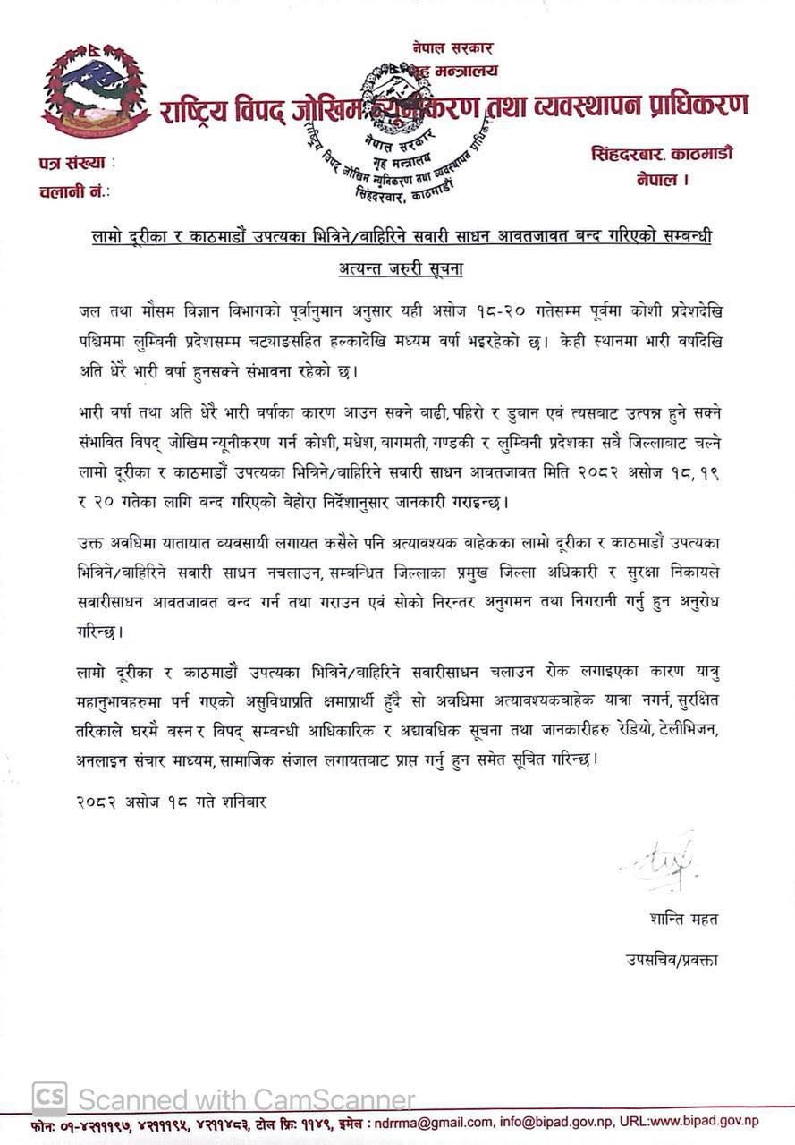 प्राधिकरणले भारी वर्षा तथा अति धेरै भारी वर्षाका कारण आउन सक्ने बाढी, पहिरो र डुबान एवं त्यसबाट उत्पन्न हुने सक्ने सम्भावित विपद् जोखिम न्यूनीकरण गर्न कोशी, मधेस, बागमती, गण्डकी र लुम्बिनी प्रदेशका सबै जिल्लाबाट चल्ने लामो दूरीका र काठमाडौँ उपत्यका भित्रिने र बाहिरिने सवारी साधन आवतजावत आज असोज १८ देखि २० गतेसम्मका लागि बन्द गरिएको जनाएको छ ।