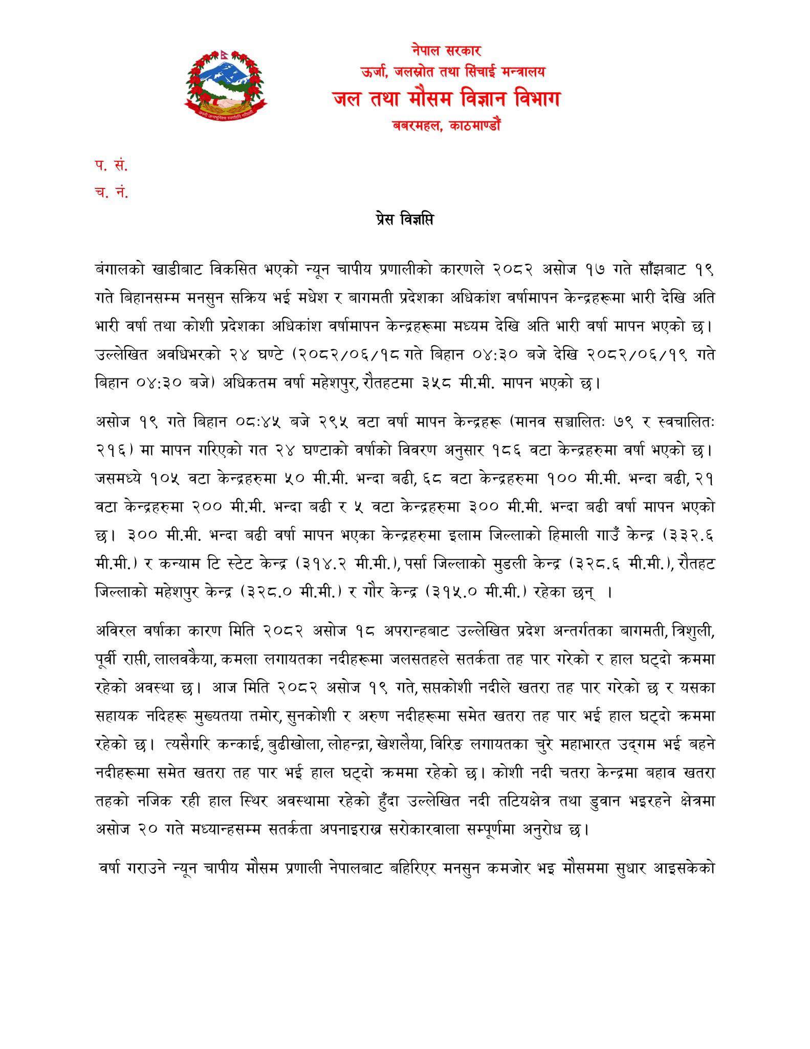 बङ्गालको खाडीबाट विकसित भएको न्यूनचापीय प्रणालीका कारण यही असोज १७ गतेदेखि आज बिहानसम्म सक्रिय रहेको तथा त्यसबाट देशका विभिन्न भागमा परेको प्रभावबारे विभागले जानकारी दिएको छ ।।