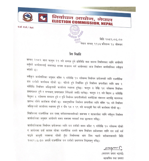 काठमाडौँ – निर्वाचन आयोगले फागुन २१ गते सम्पन्न हुने प्रतिनिधि सभा सदस्य निर्वाचनकको कार्यतालिका स्वीकृत गरेको छ ।