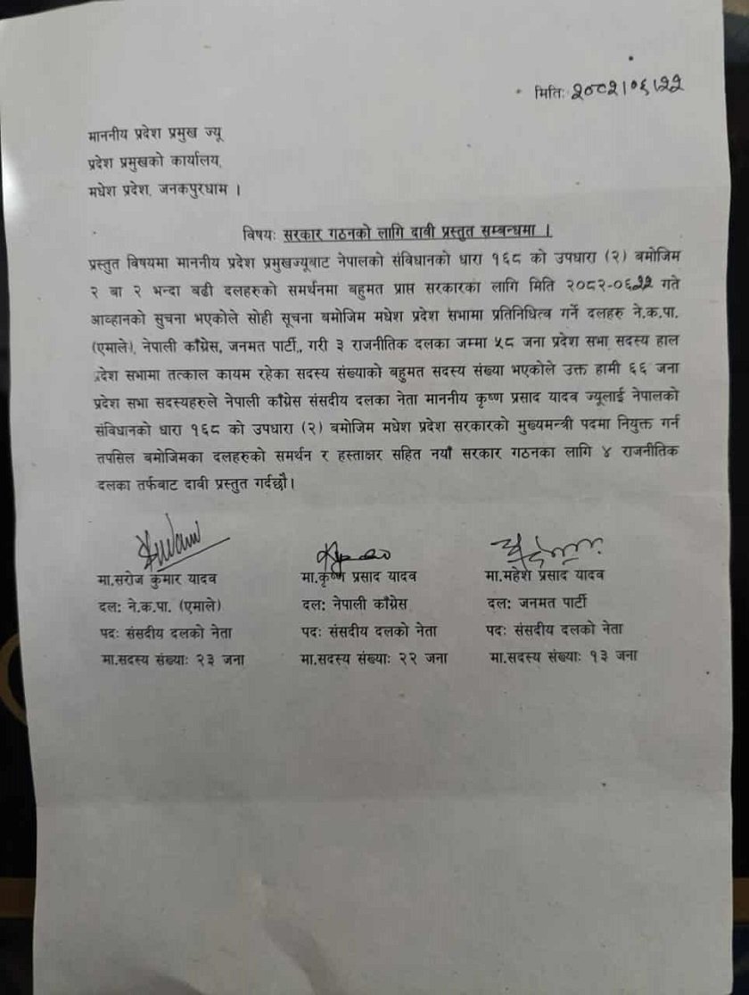 नेपालको संविधानको धारा १६८ को उपधारा २ बमोजिम नेपाली काँग्रेस मधेश प्रदेश संसदीय दलका नेता कृष्णप्रसाद यादवलाई मुख्यमन्त्रीमा नियुक्त गर्न तीन दलका ५८ जना सदस्यहरुको हस्ताक्षरसहितको दावी प्रदेश प्रमुख समक्ष पेश गरिएको हो ।