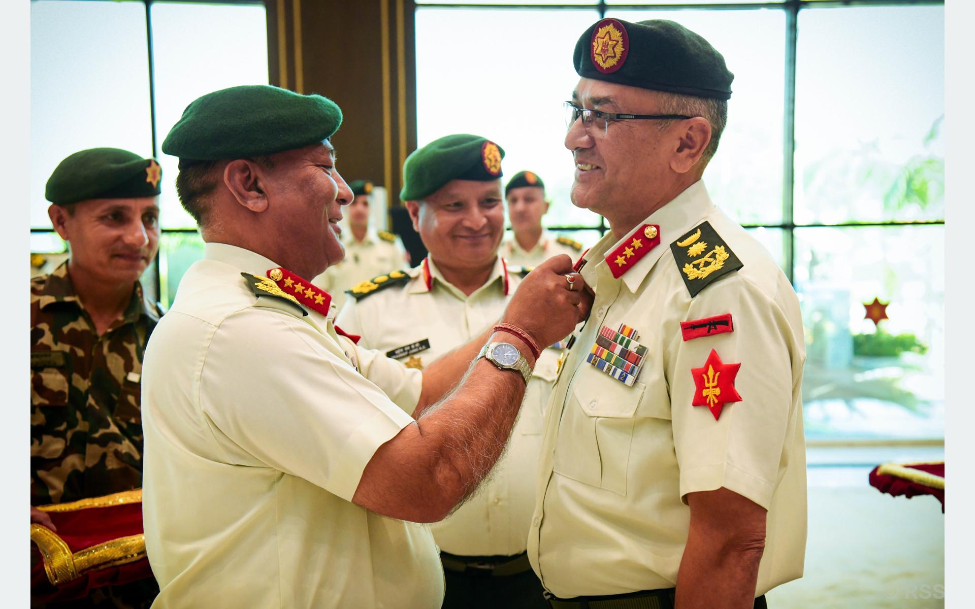 काठमाडौँ- प्रधानसेनापति अशोकराज सिग्देलले रथीमा पदोन्नति हुनुभएका गणेशकुमार श्रेष्ठलाई बढुवा भएको पदको दर्ज्यानी चिह्न प्रदान गर्नुभएको छ ।