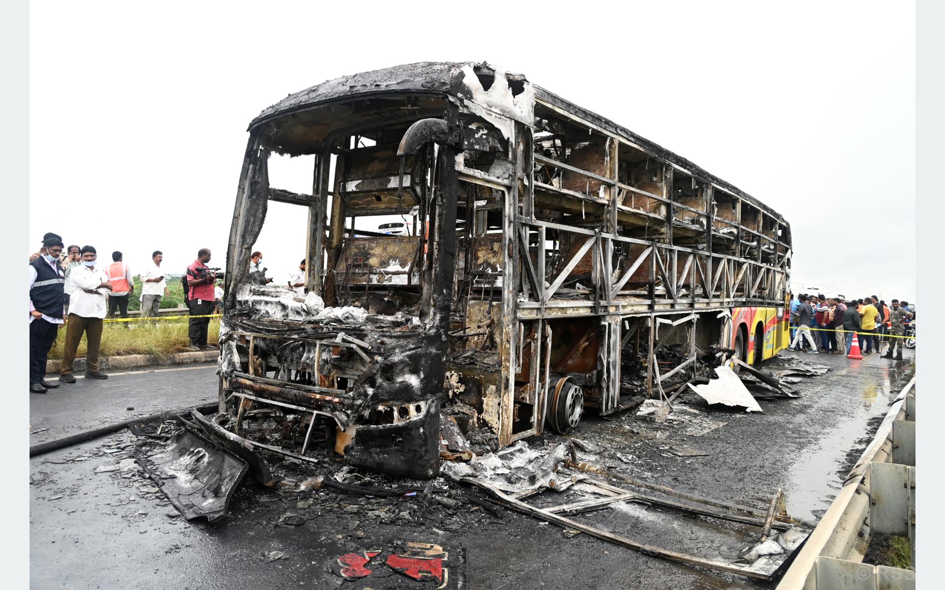 आन्ध्र प्रदेश राज्यको कुर्नुल नजिकै राजमार्गमा भएको दुर्घटनामा ४४ यात्रु बोकेको बस तेलङ्गाना राज्यको हैदराबादबाट कर्नाटकको बेङ्गलुरु तर्फ जाँदै थियो । बसमा आगो केही मिनेटभित्रै फैलियो र केही यात्रु झ्याल फुटाएर बाहिर निस्कन सफल भए भने धेरैको मद्दत पुग्नु अघि नै जलेर मृत्यु भयो । वरिष्ठ प्रहरी अधिकारी विक्रान्त पाटिलका अनुसार मोटरसाइकलले बसलाई पछाडिबाट ठोक्किँदा स्पार्कले बसको इन्धन ट्याङ्कीलाई भेटेको थियो ।