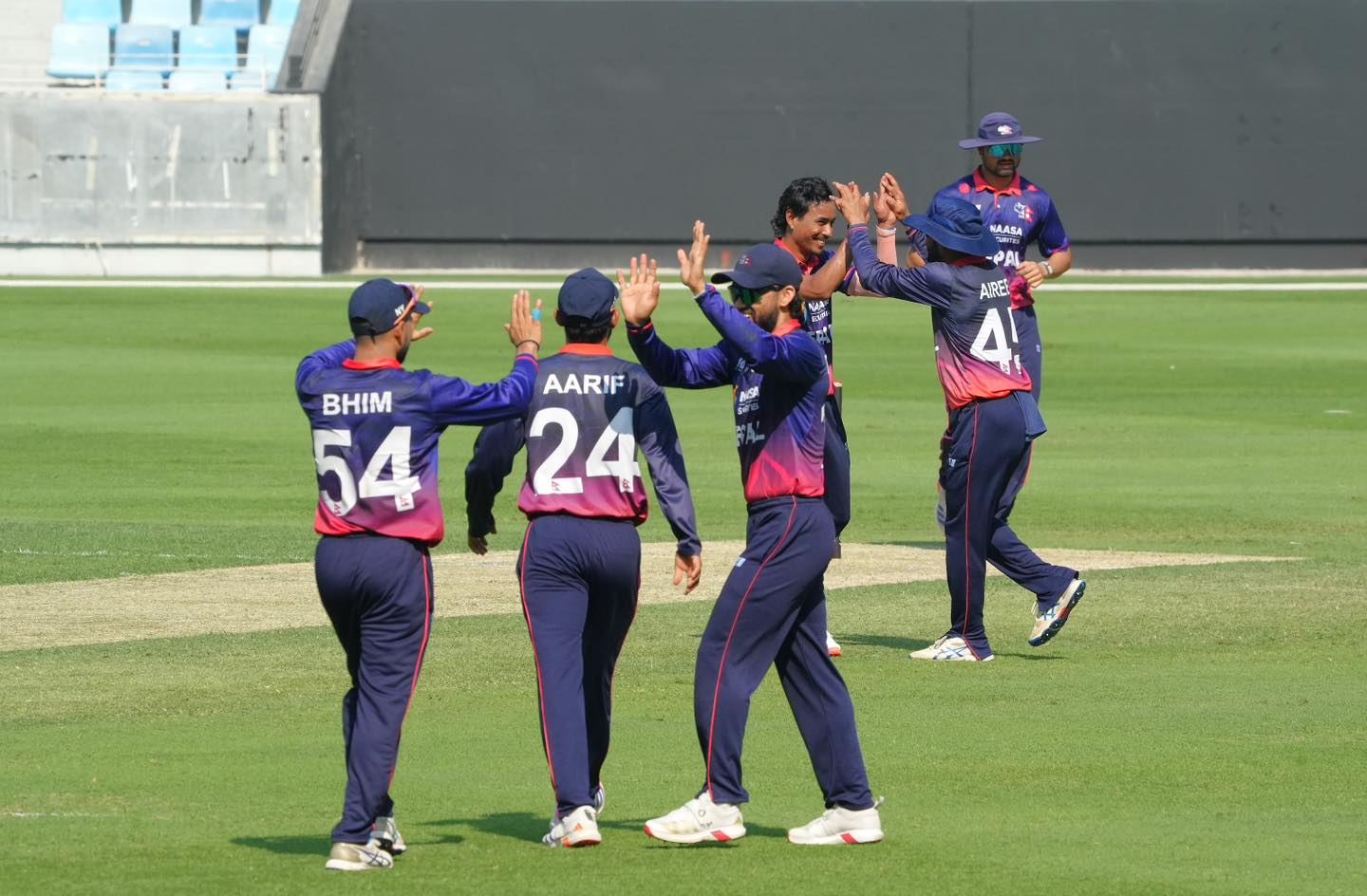 नेपालका सन्दीप लामिछानेले २ विकेट लिए भने सोमपाल कामी, दीपेन्द्रसिंह ऐरी र आरिफ शेखले १-१ विकेट लिएका थिए ।
