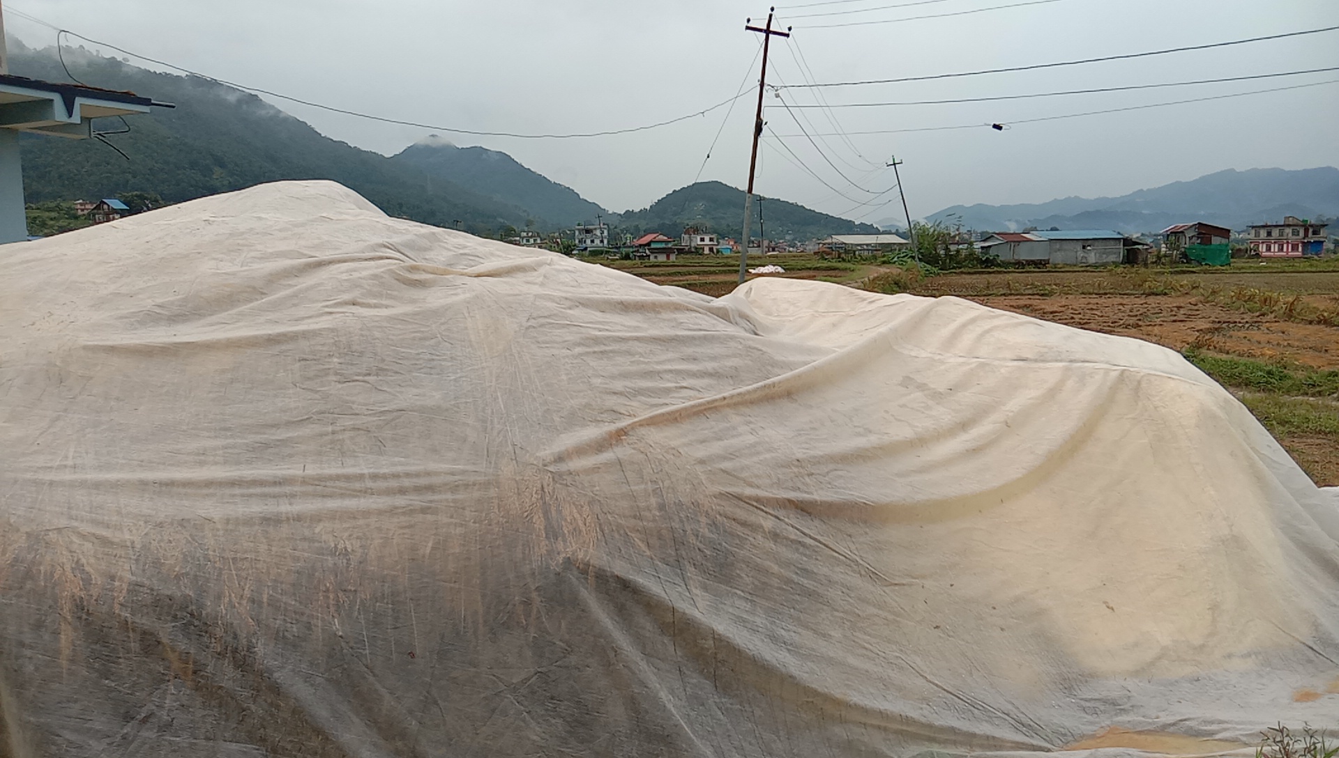 किसानहरूले काटेर थुपारेको धान समेत भिजेपछि खेतमै त्रिपाल ओढाएका छन् । कुनेउ लगाएर राखेको धाननै भिज्ने गरी निरन्तर बर्षा भएपछि किसानहरूले खेतमै भएको धानको कुने उमा त्रिपाल ओढाएका छन् । काटेर जम्मा पार्न नसकिएको धान खेतमै पूर्ण रूपमा भिजेको भन्दै किसानहरूले चिन्ता व्यक्त गरेका छन् ।