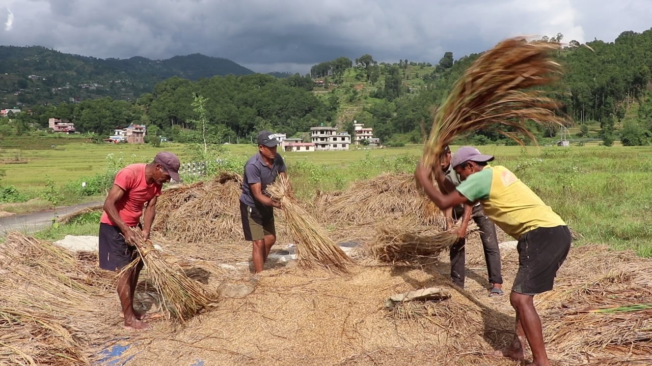भिजेकै भए पनि धान भित्र्याउन व्यस्त धादिङका किसान