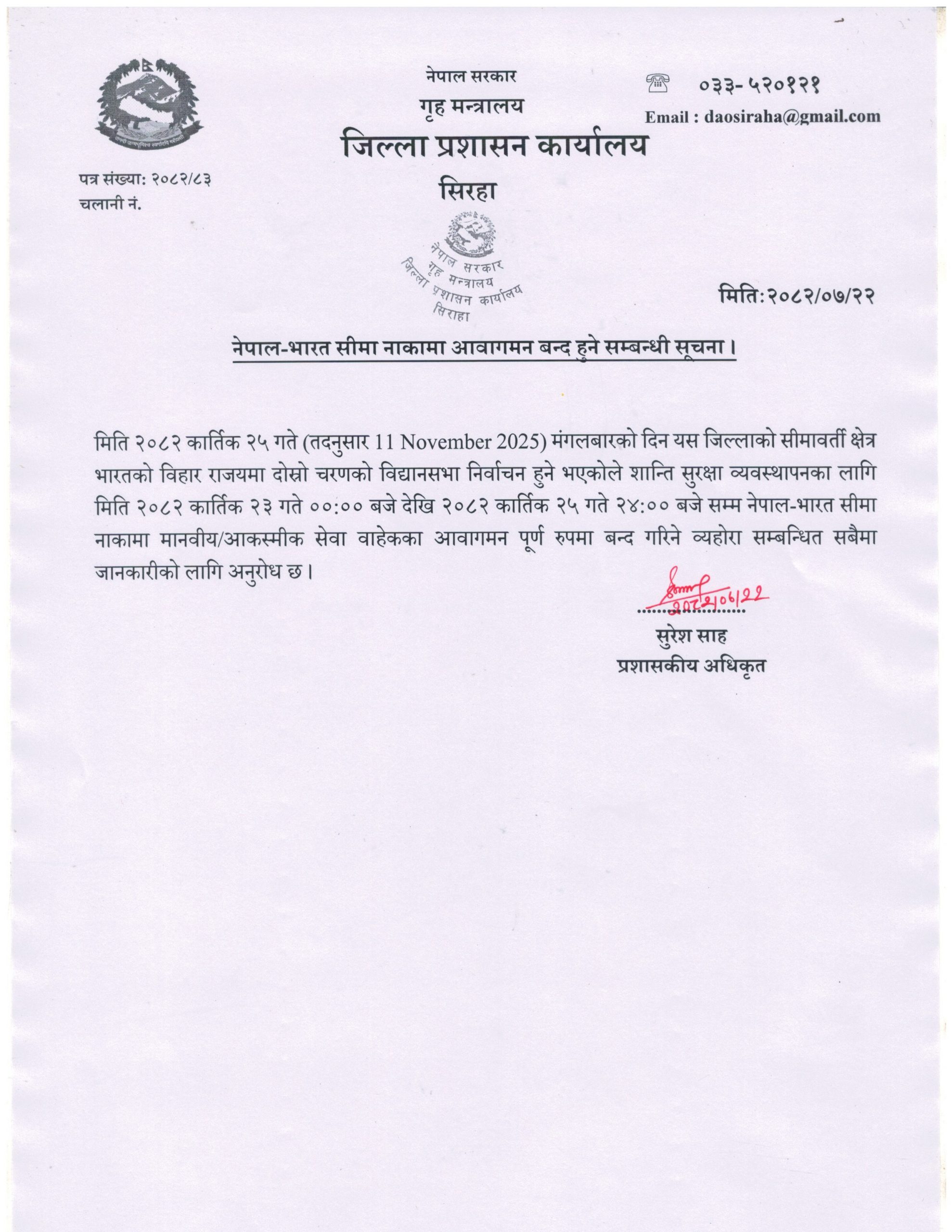जिल्ला प्रशासन कार्यालयद्वारा आज जारी गरिएको सूचनामा भारतको विहार राज्यमा हुने विधानसभा निर्वाचनका कारण सिरहासँग जोडिएका सीमानाका तीन दिनसम्म बन्द गरिने निर्णय गरिएको उल्लेख छ ।