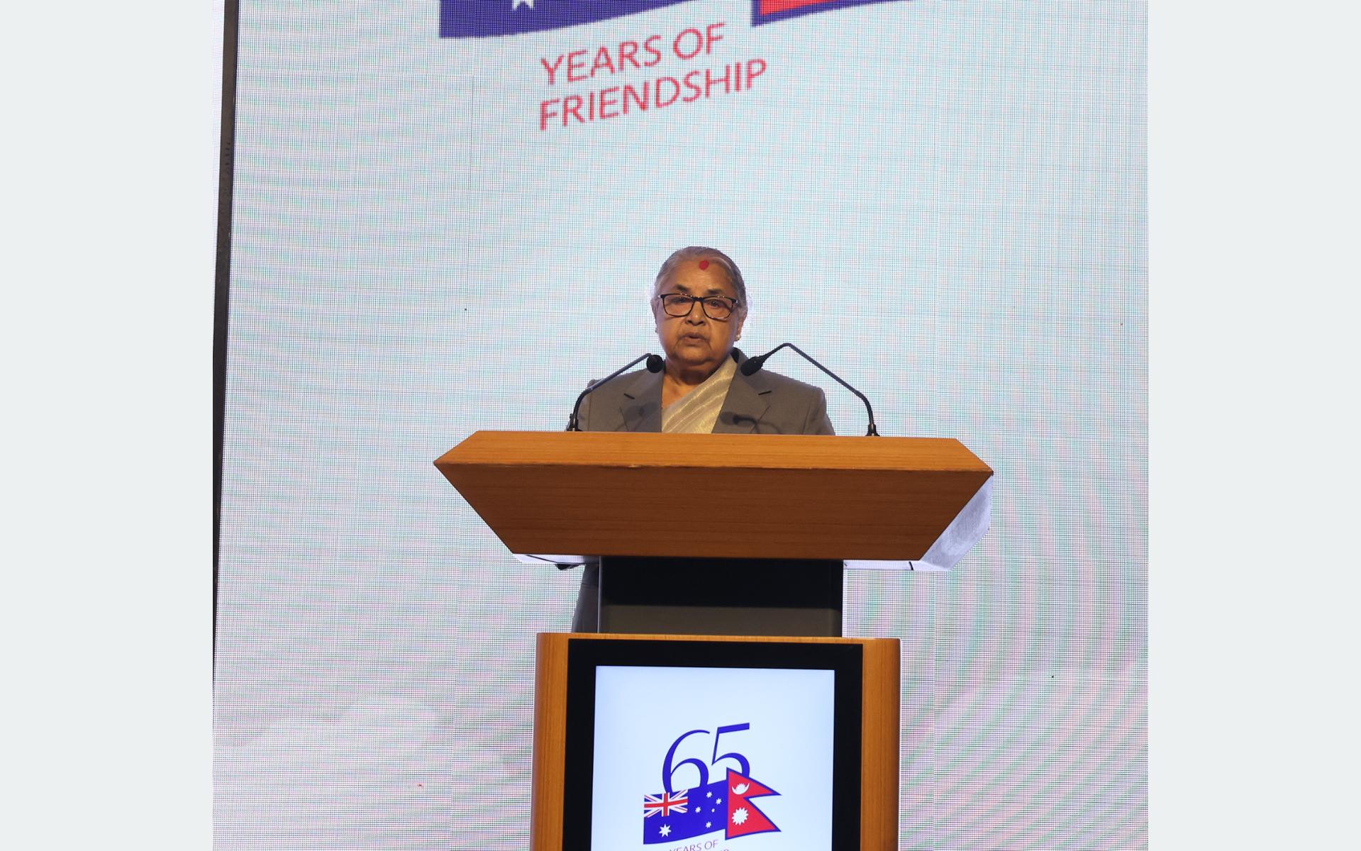 नेपाल र अस्ट्रेलियाबीचमा औपचारिक सम्बन्ध स्थापना भएदेखि नै निरन्तर मित्रता सुदृढ हुँदै आइरहेको बताउँदै उहाँले शिक्षा, व्यापार, विकास र संस्कृतिसहितका महत्त्वपूर्ण क्षेत्रमा दशकौँदेखिको सहकार्यका लागि आभार व्यक्त गर्नुभयो । उहाँले भन्नुभयो, “नेपालको विकास यात्रामा अस्ट्रेलिया एक विश्वस्त साझेदार रहँदै आएको छ । शिक्षा, स्वास्थ्य, सुशासन, ग्रामीण विकास र विपद् व्यवस्थापनजस्ता क्षेत्रमा प्राप्त सहयोगले हाम्रो राष्ट्रिय प्रगतिमा महत्त्वपूर्ण योगदान पुगेको छ ।”