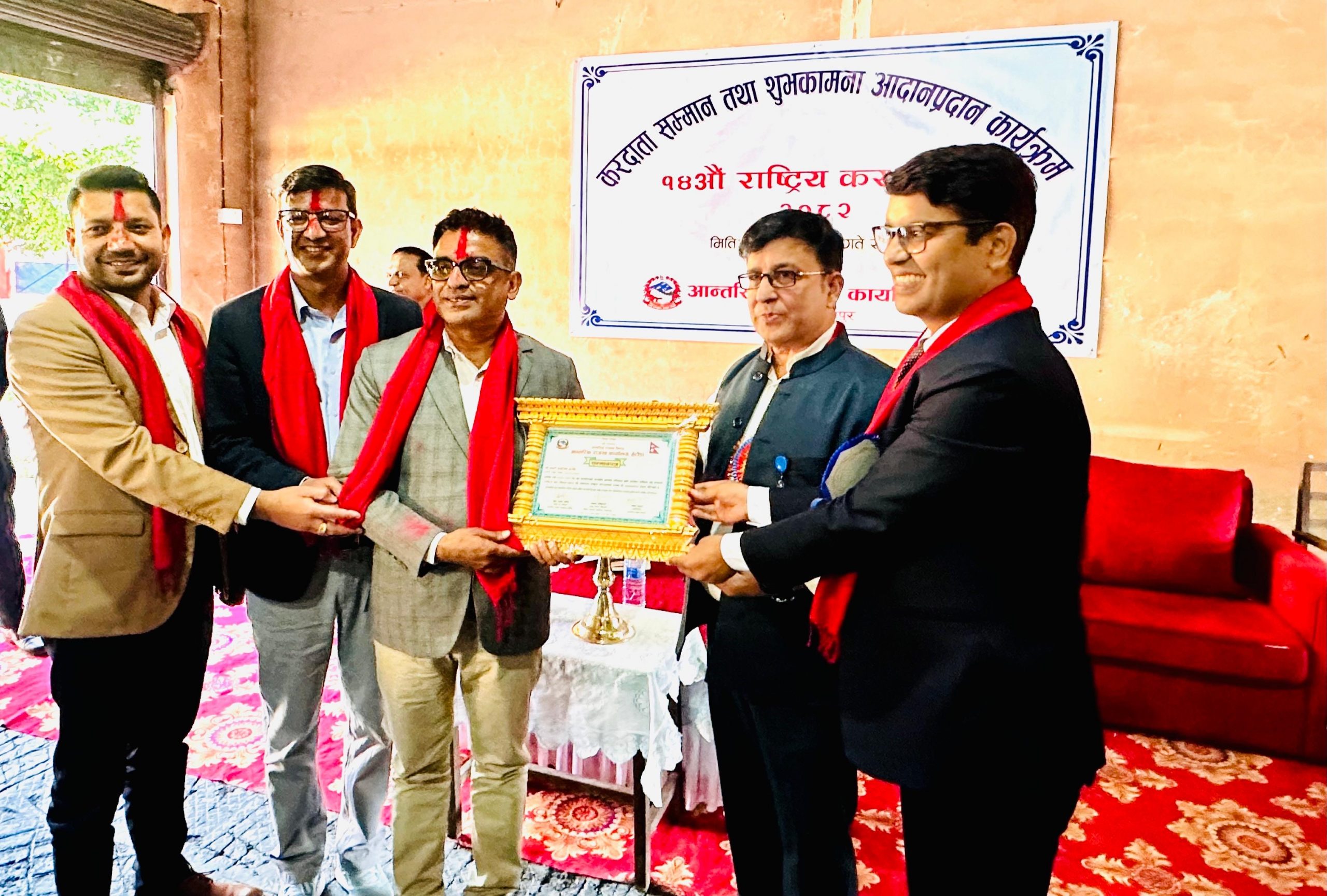 आन्तरिक राजश्व विभागको एकीकृत कर प्रणाली अनुसार गत आर्थिक वर्षमा आयकर तर्फ सर्वाधिक कर दाखिला गरेको आधारमा कम्पनीलाई १४औँ राष्ट्रिय कर दिवस–२०८२ को अवसरमा आयोजित कार्यक्रममा सम्मान गरिएको हो । उक्त कार्यक्रममा प्रमुख जिल्ला अधिकारी बसन्त अधिकारीले कम्पनीका सञ्चालकहरू यादव घिमिरे, सुवास भण्डारी र विजय पौडेललाई सम्मानपत्र प्रदान गर्नुभयो । कम्पनीले स्थापनाको १० वर्षमै उत्कृष्ट करदाताको पहिचान बनाउन सफल भएको हो । कम्पनीले टिस्यू, न्याप्किन लगायतका सामग्री उत्पादन गर्दै आएको छ । त्यस्तै, सबै भन्दा बढी अन्तःशुल्क राजस्व दाखिला गर्ने करदाता गोर्खा लाहरी प्रा.लिलाई पनि सम्मान गरिएको छ । साथै कार्यालयलाई सहयोग पु¥याउने मकवानपुर उद्योग वाणिज्य संघ, थाहा उद्योग वाणिज्य संघ, अडिटर्स एसोसिएसन, कर सहयोगी श्रमिक संगठनलाई पनि सम्मानपत्र प्रदान गरिएको थियो । कार्यक्रममा बोल्दै प्रमुख जिल्ला अधिकारी अधिकारीले करसँग सम्बन्धित सबै पक्षलाई यस दिवसले समेट्नुपर्नेमा जोड दिनुभयो । हिजोभन्दा आज कर प्रणाली सहज र स्मार्ट बन्दै गएको उल्लेख गर्दै उहाँले यातायात, मालपोत, स्थानीय तह र नापी लगायतका निकायहरूमा पनि व्यवस्थित कर प्रणाली हुनुपर्ने आवश्यकता औंल्याउनुभयो ।