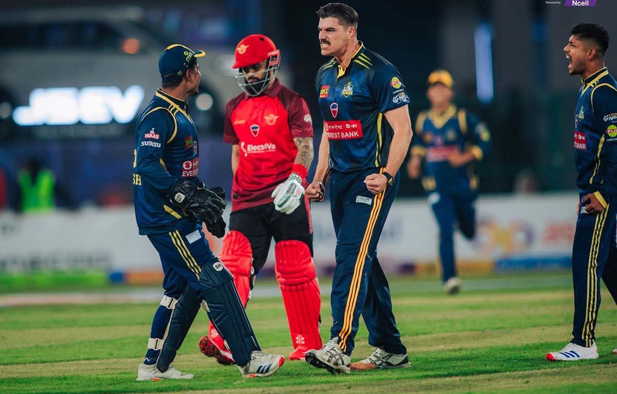 बलिङमा विराटनगरका प्रतिश जिसी, शुभम रञ्जाने, मार्चन्ट डि लिङगे र कप्तान सन्दीप लामिछानेले दुई÷दुई तथा बसिर अहमद र सूर्य तामाङले एक÷एक विकेट ।
