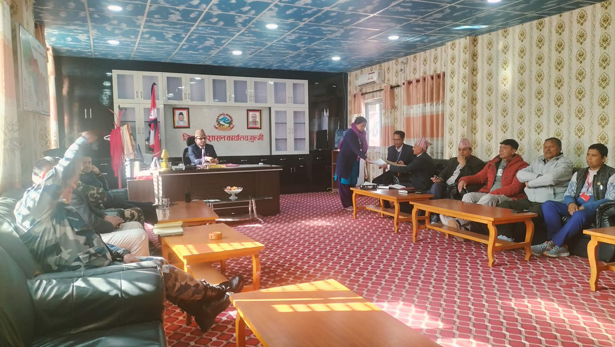 प्रमुख जिल्ला अधिकारी बद्रीनाथ गैरेको अध्यक्षतामा जिल्ला प्रशासन कार्यालय गुल्मीमा बसेको बैठकमा जिल्लामा क्रियाशील गैरसरकारी सङ्घ संस्थाका प्रतिनिधिहरूको सहभागिता रहेको थियो।