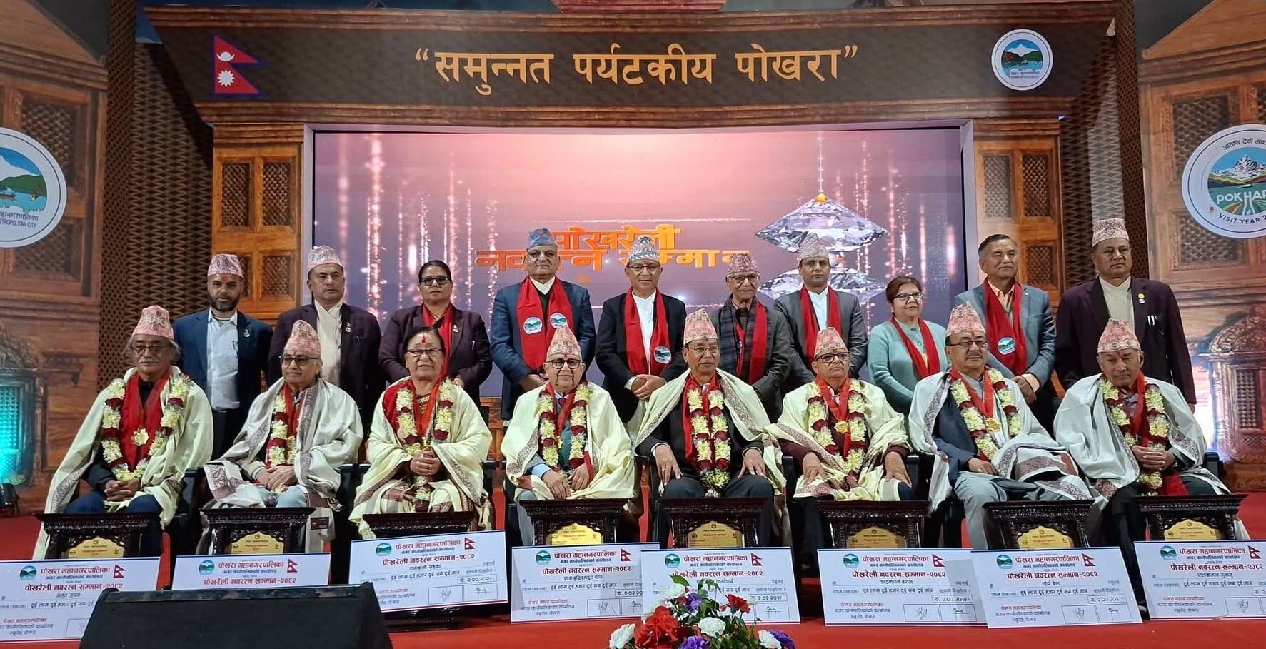 कास्की- पोखरा महानगरपालिकाले आफ्नो ६७ औँ स्थापना दिवसमा समाजका विभिन्न क्षेत्रका नौ अग्रजलाई ‘पोखरेली नवरत्न’ सम्मान प्रदान गरेको छ। गण्डकी प्रदेशका मुख्यमन्त्री सुरेन्द्रराज पाण्डे र महानगरका प्रमुख धनराज आचार्यले बुधबार आयोजित समारोहमा उहाँहरूलाई जनही दुई लाख दुई हजार दुई सय दुई रुपियाँ, ताम्रपत्र र पदकसहित सम्मान गर्नु भएको हो।