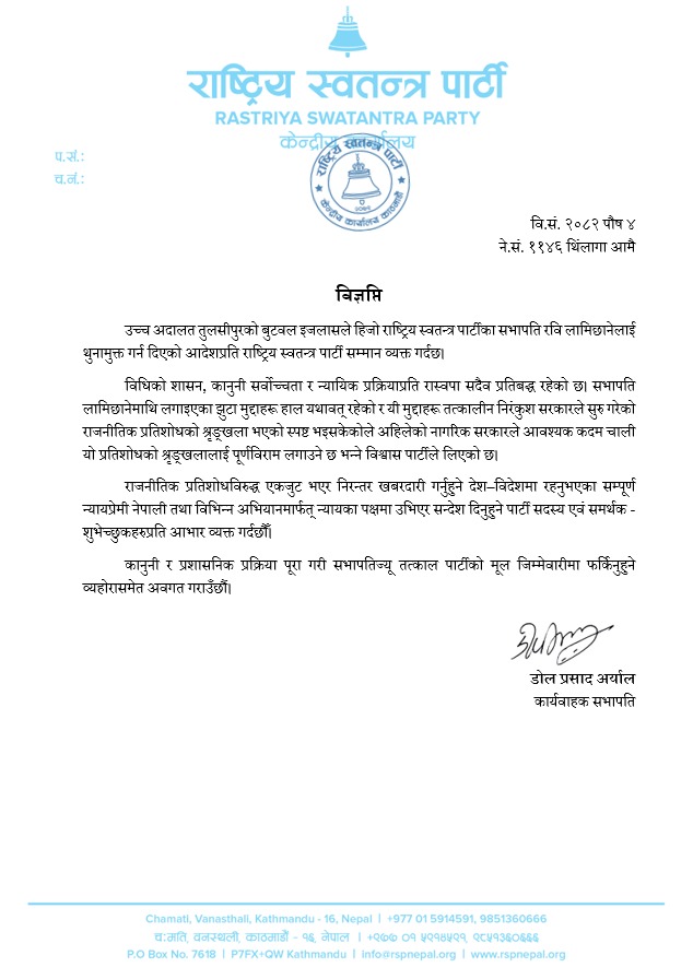 रास्वपाका कार्यवाहक पार्टी सभापति डोल प्रसाद अर्यालले आज एक प्रेस विज्ञप्ति जारी गर्दै लामिछाने थुनामुक्त भएसँगै सभापतिको जिम्मेवारीमा फर्कने जानकारी गराउनु भएको हो । यस्तै रास्वपाले उच्च अदालत तुलसीपुरको बुटवल इजलासले रवि लामिछानेलाई थुनामुक्त गर्न दिएको आदेशप्रति सम्मान व्यक्त गरेको छ ।