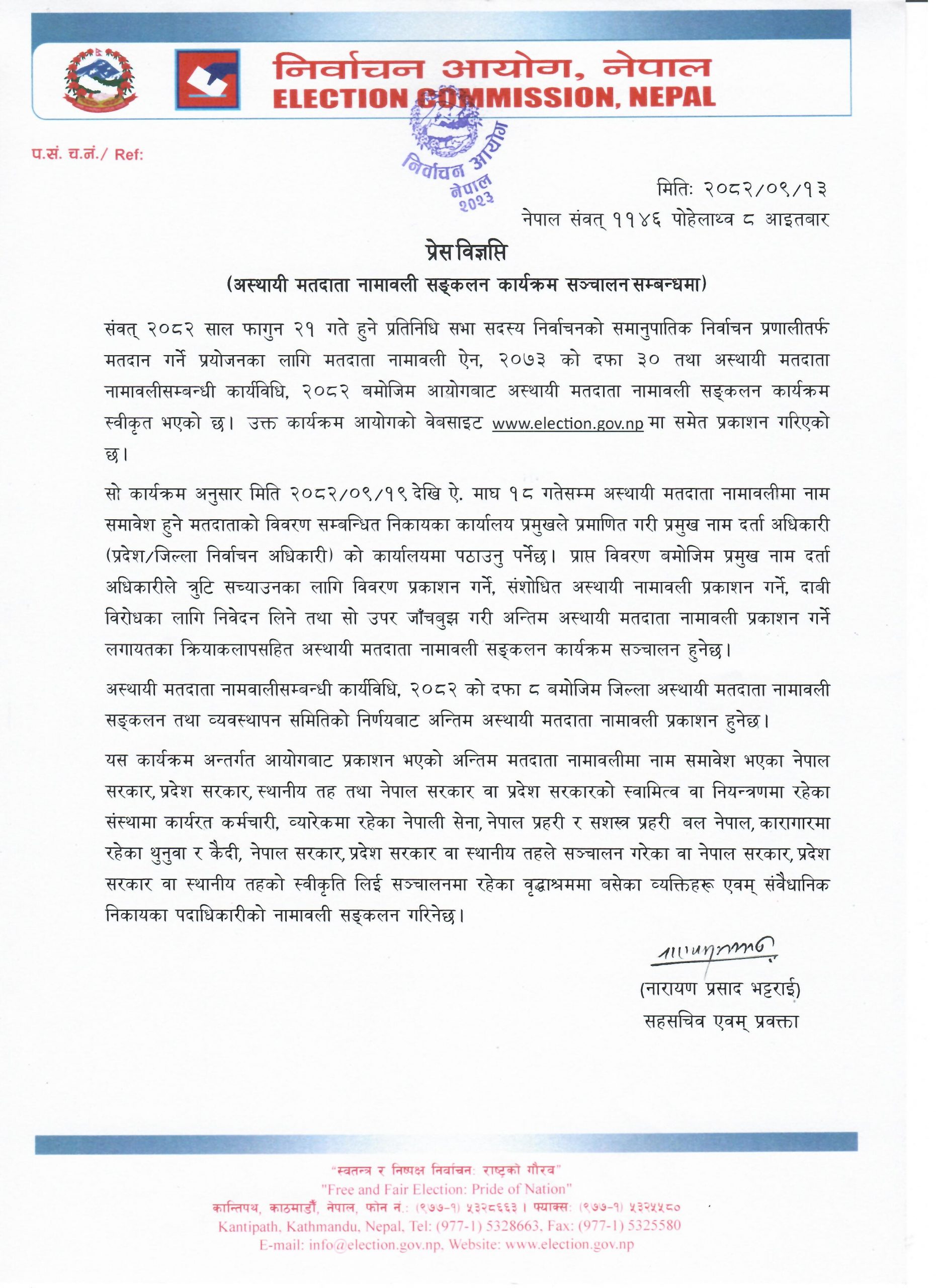 आगामी फागुन २१ गते हुने प्रतिनिधि सभा निर्वाचनको समानुपातिक निर्वाचन प्रणालीतर्फ मतदान गर्ने प्रयोजनका लागि यो अस्थायी मतदाता नामावली सङ्कलन गर्न लागिएको आयोगले जनाएको छ।