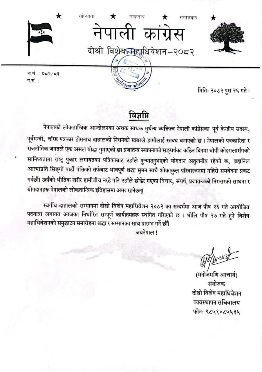 पूर्वमन्त्री तथा नेपाली कांग्रेसका पूर्वकेन्द्रीय सदस्य होमनाथ दाहालको गएराति निधन भएपछि कांग्रेस विशेष महाधिवेशनले आज हुने सबै कार्यक्रम स्थगित गरेको हो ।