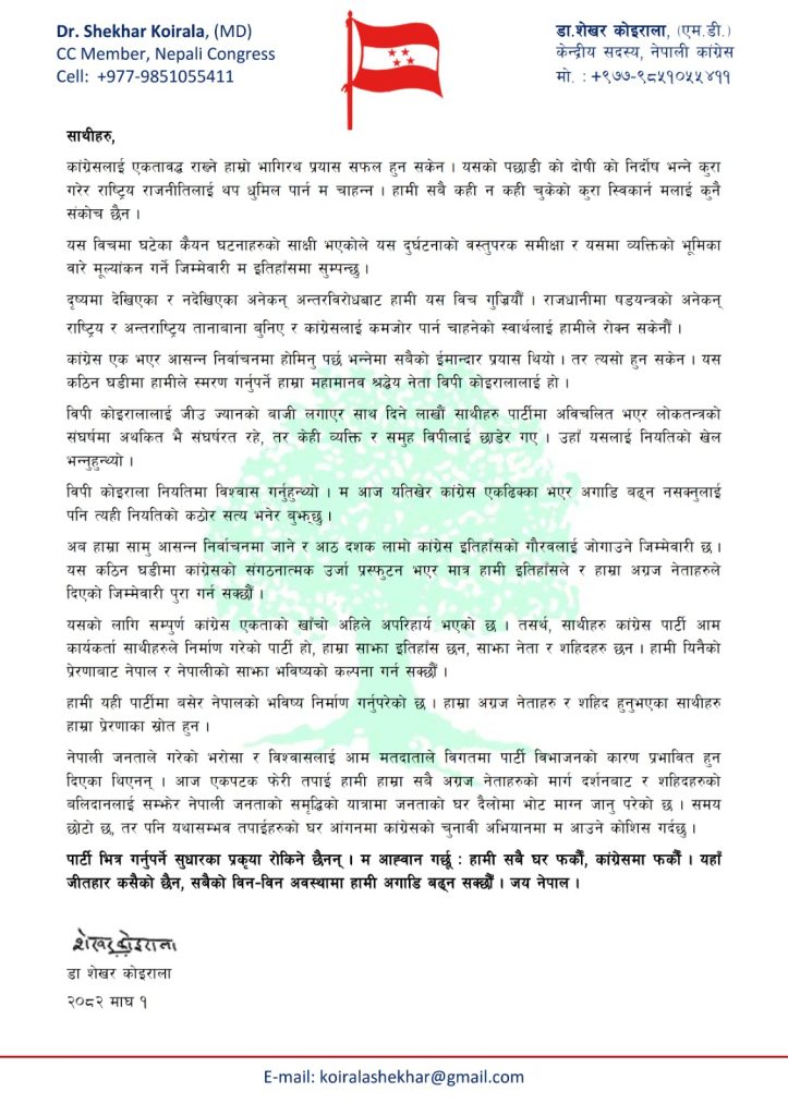 नेता डा कोइरालाले पार्टीभित्र गर्नुपर्ने सुधारका प्रक्रिया नरोकिने भन्दै सबैलाई आफ्नो घरमा फर्कन विज्ञप्तिमार्फत आह्वान गर्नुभएको छ ।