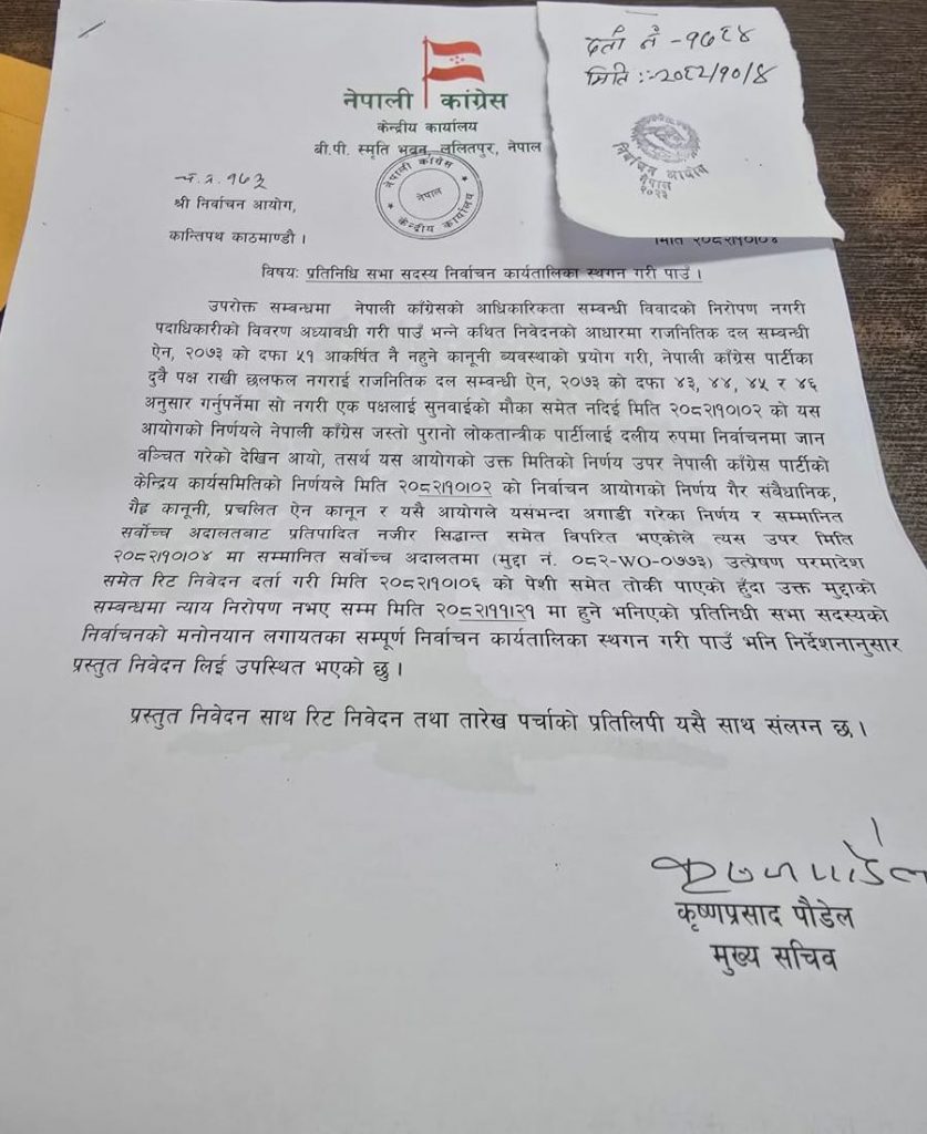 पार्टी कार्यालयका मुख्यसचिव कृष्णप्रसाद पौडेल र पूर्वमहान्यायधिवक्ता खम्बबहादुर खाती र अधिवक्ता केशवराज जोशीले निर्वाचन आयोग पुगेर निर्वाचन कार्यक्रम स्थगनको निवेदन दर्ता गराएका छन्।