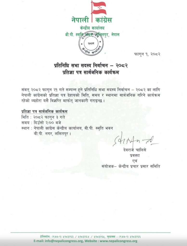 चालिसका अनुसार अनुसार घोषणा पत्र सार्वजनिकका लागि कांग्रेसले आइतबार दिउँसो २ बजे सानेपास्थित पार्टी केन्द्रीय कार्यालयमा पत्रकार सम्मेलन गरिएको छ ।