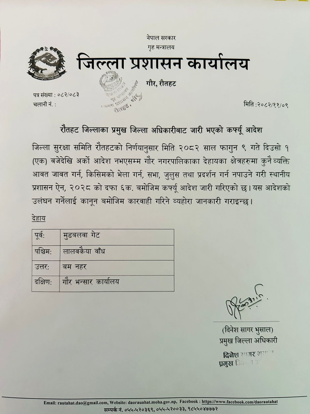 रौतहट- जिल्ला प्रशासन कार्यालय रौतहटले सदरमुकाम गौरमा कफ्‌र्यु आदेश जारी गरेको छ ।