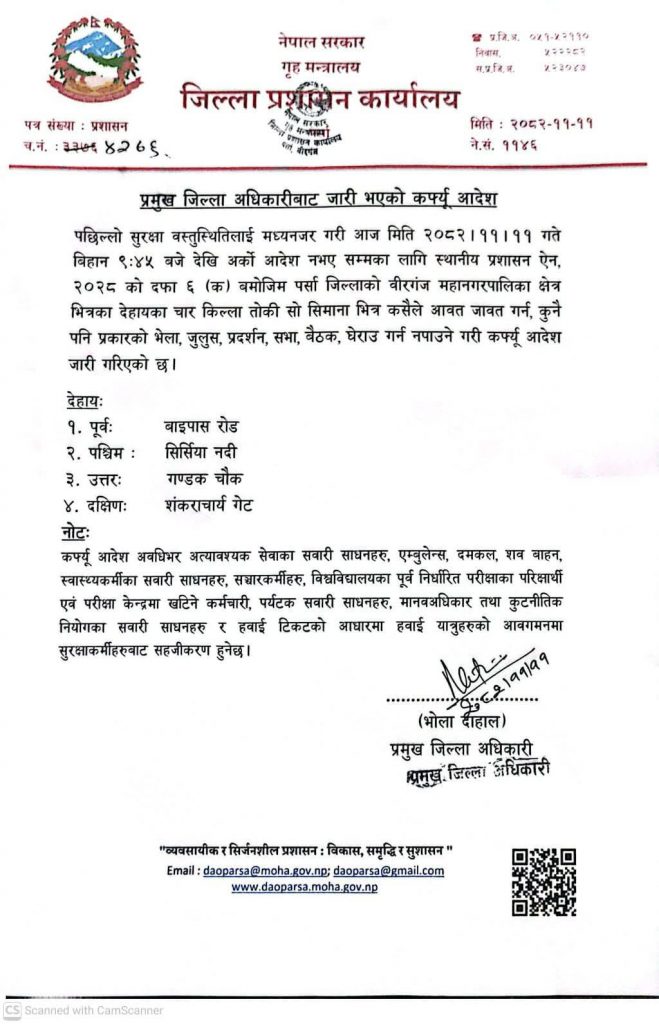 जिल्ला प्रशासन कार्यालय पर्सा ले आज बिहान ९:४५ बजेदेखि अर्को आदेश नभएसम्मका लागि कर्फ्यु लागू गरेको हो। प्रमुख जिल्ला अधिकारीको आदेशअनुसार स्थानीय प्रशासन ऐन, २०२८ को दफा ६ (क) बमोजिम वीरगन्ज महानगरपालिकाको तोकिएको क्षेत्रमा आवतजावत, भेला, जुलुस, प्रदर्शन, सभा–बैठक लगायतका गतिविधिमा पूर्ण रोक लगाइएको छ ।