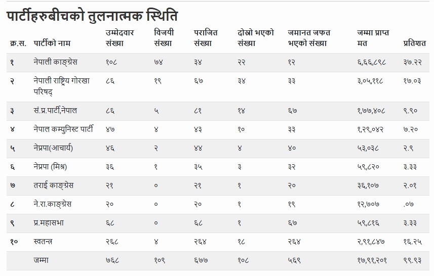 १०९ निर्वाचन क्षेत्रमा सम्पन्न उक्त निर्वाचनमा नेपाली कांग्रेसले ७४ सिट जितेर दुई तिहाइ बहुमत प्राप्त गरेको थियो।