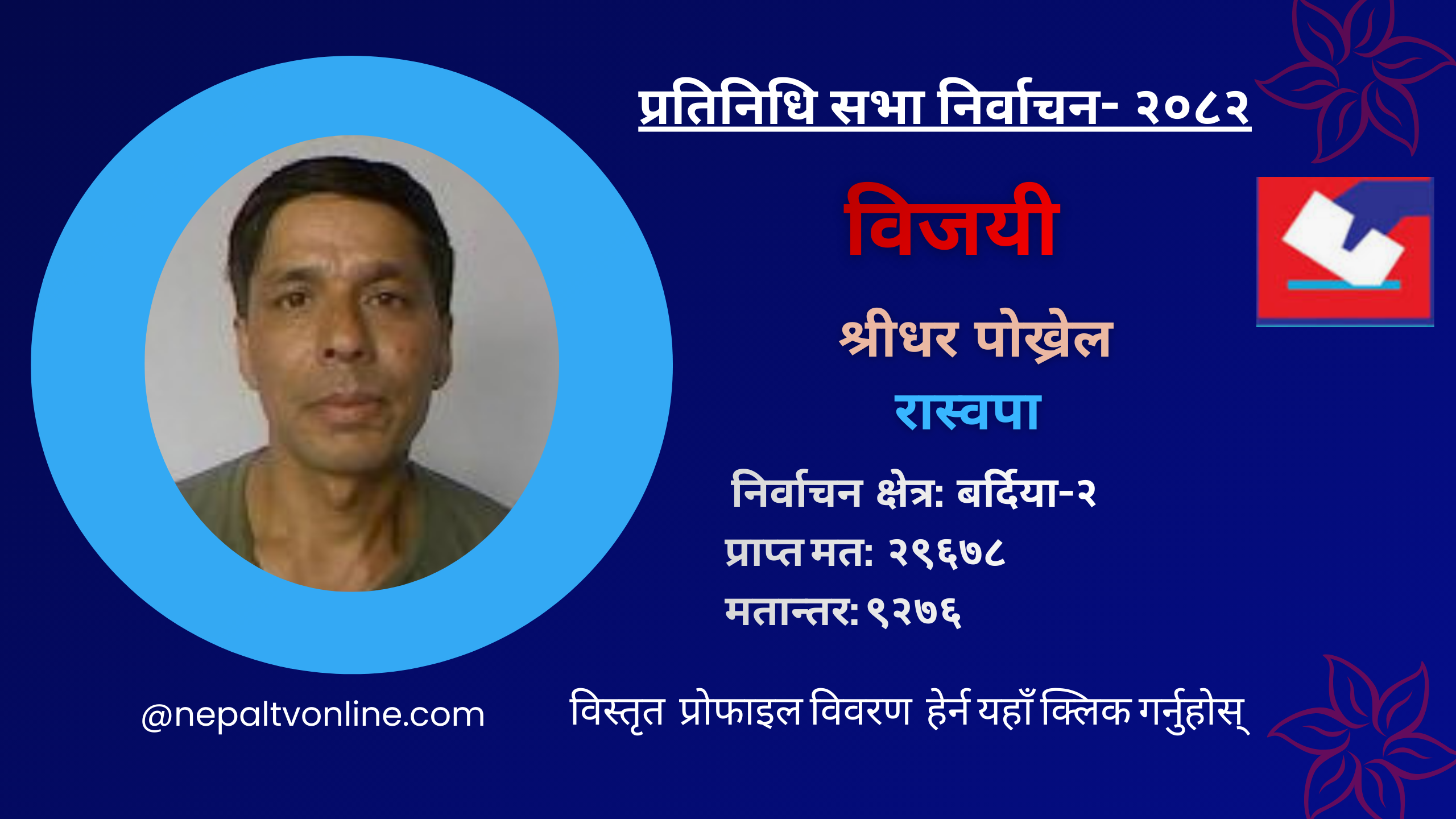 काठमाडौँ- बर्दिया-२ बाट राष्ट्रिय स्वतन्त्र पार्टीका श्रीधर पोख्रेलले विजयी हुनुभएको छ। रास्पवाका पोख्रेलले २९६७८ मत ल्याएर विजयी हुनुभएको छ। उहाँका निकटतम् प्रतिद्वन्द्वी नेपाली काँग्रेसका किशोर सिंह राठौरले २०४०२ मत प्राप्त गर्नुभएको छ ।