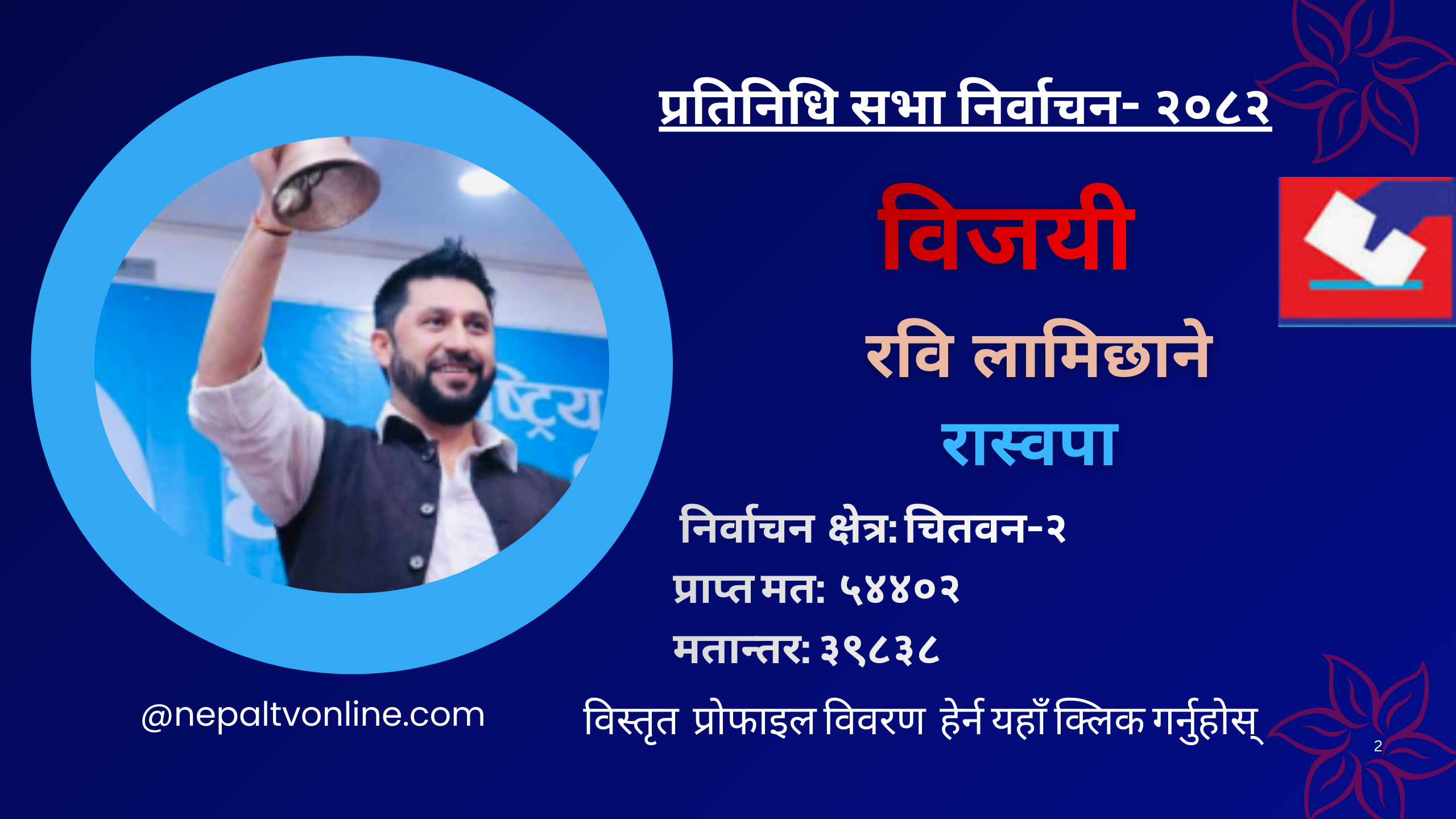 चितवन-चितवन क्षेत्र नं २ बाट राष्ट्रिय स्वतन्त्र पार्टीका सभापति रवि लामिछाने विजयी हुनुभएको छ । उहाँले ५४ हजार ४०२ मत प्राप्त गर्नुभयो । नेपाली कांग्रेसकी उम्मेदवार मीनाकुमारी खरेलले १४ हजार ५६४ मत प्राप्त गर्नुभएको छ ।