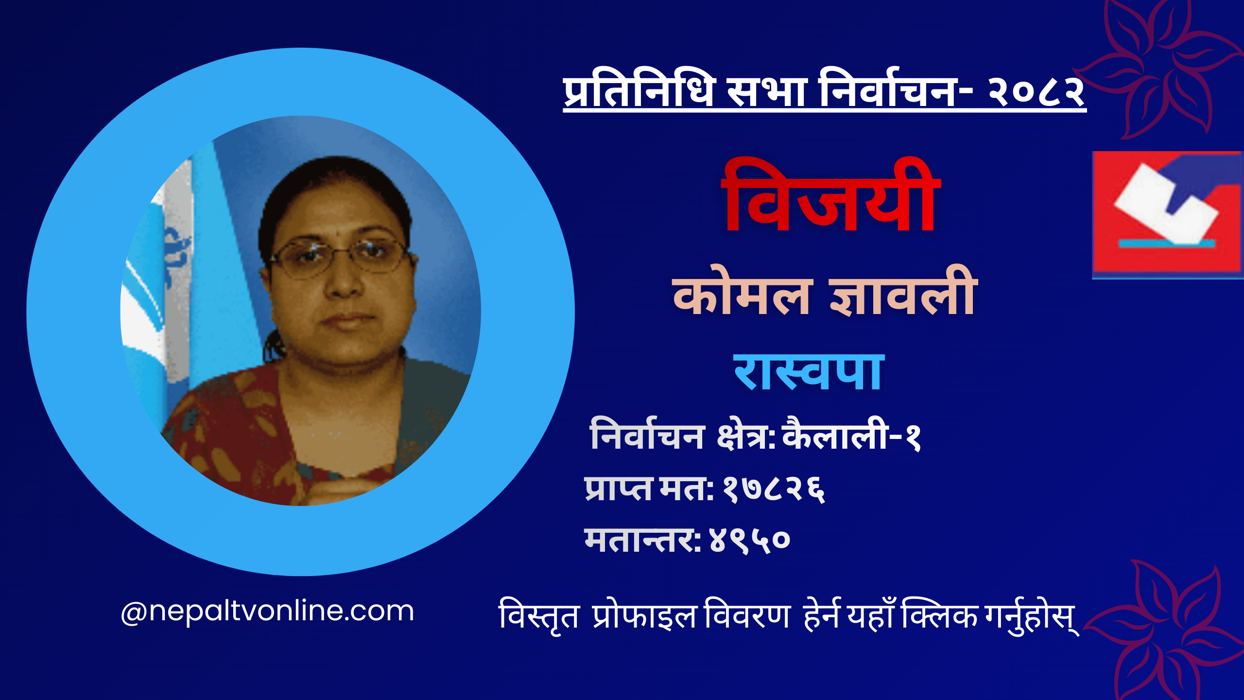 घोडाघोडी (कैलाली)- कैलाली क्षेत्र नं १ मा राष्ट्रिय स्वतन्त्र पार्टीकी उम्मेदवार कोमल ज्ञवाली विजयी हुनुभएको छ ।
