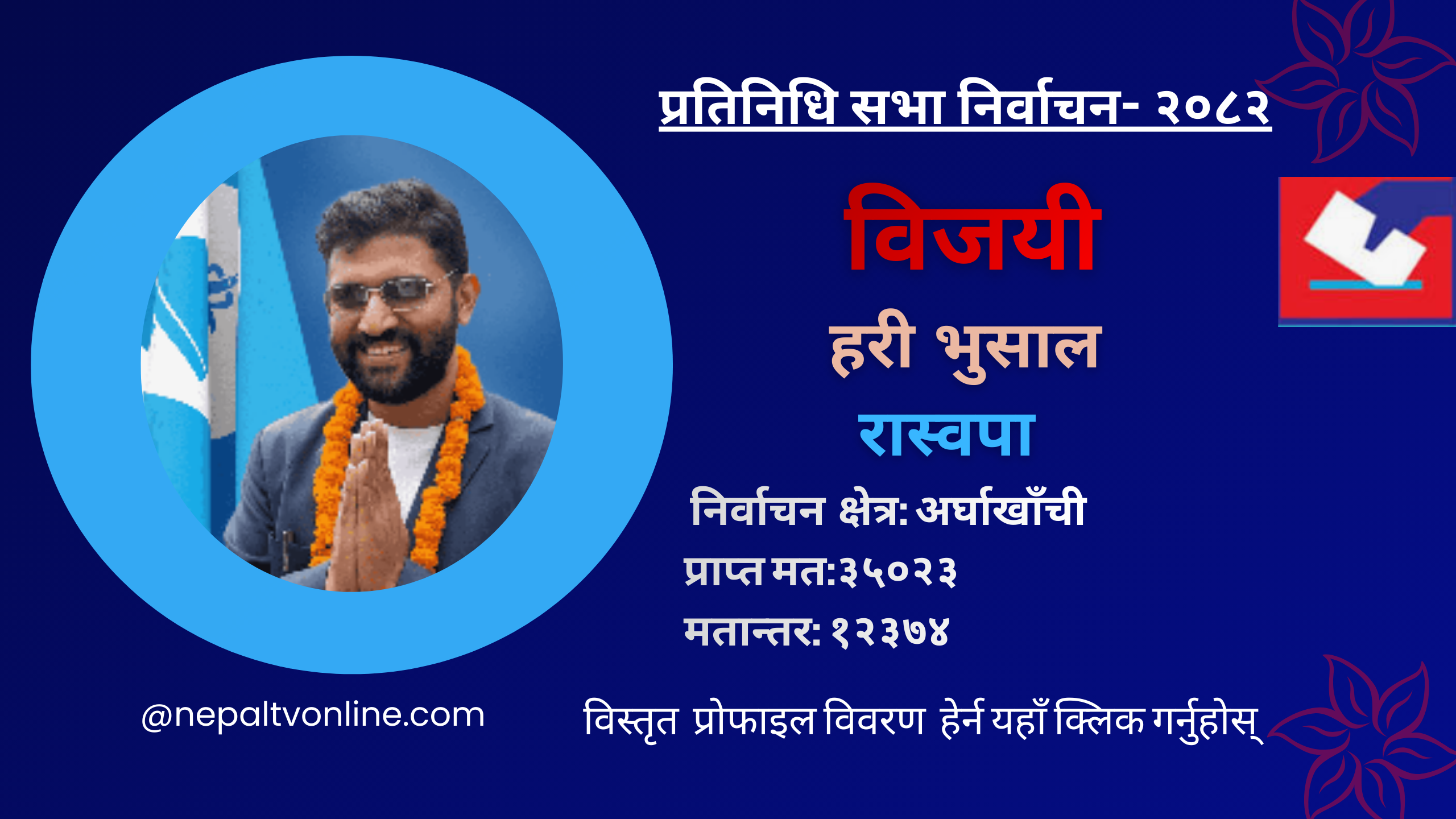 अर्घाखाँची– प्रतिनिधिसभा सदस्य निर्वाचनमा अर्घाखाँचीमा राष्ट्रिय स्वतन्त्र पार्टी (रास्वपा)का हरिप्रसाद भुसाल विजयी हुनुभएको छ । मुख्य निर्वाचन अधिकृत शिवलाल पाण्डेका अनुसार भुसालले ३५ हजार २३ मत प्राप्त गर्नुभयो ।
