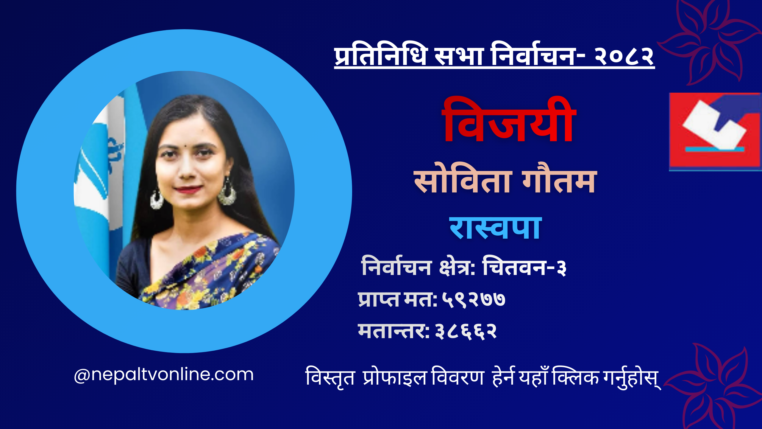 चितवन– प्रतिनिधिसभा सदस्य निर्वाचनमा चितवन क्षेत्र नम्बर ३ मा राष्ट्रिय स्वतन्त्र पार्टी (रास्वपा)का सोविता गौतम विजयी हुनुभएको छ । उहाँले ५९ हजार २७७ मत प्राप्त गर्नुभएको निर्वाचन कार्यालयले जनाएको छ ।