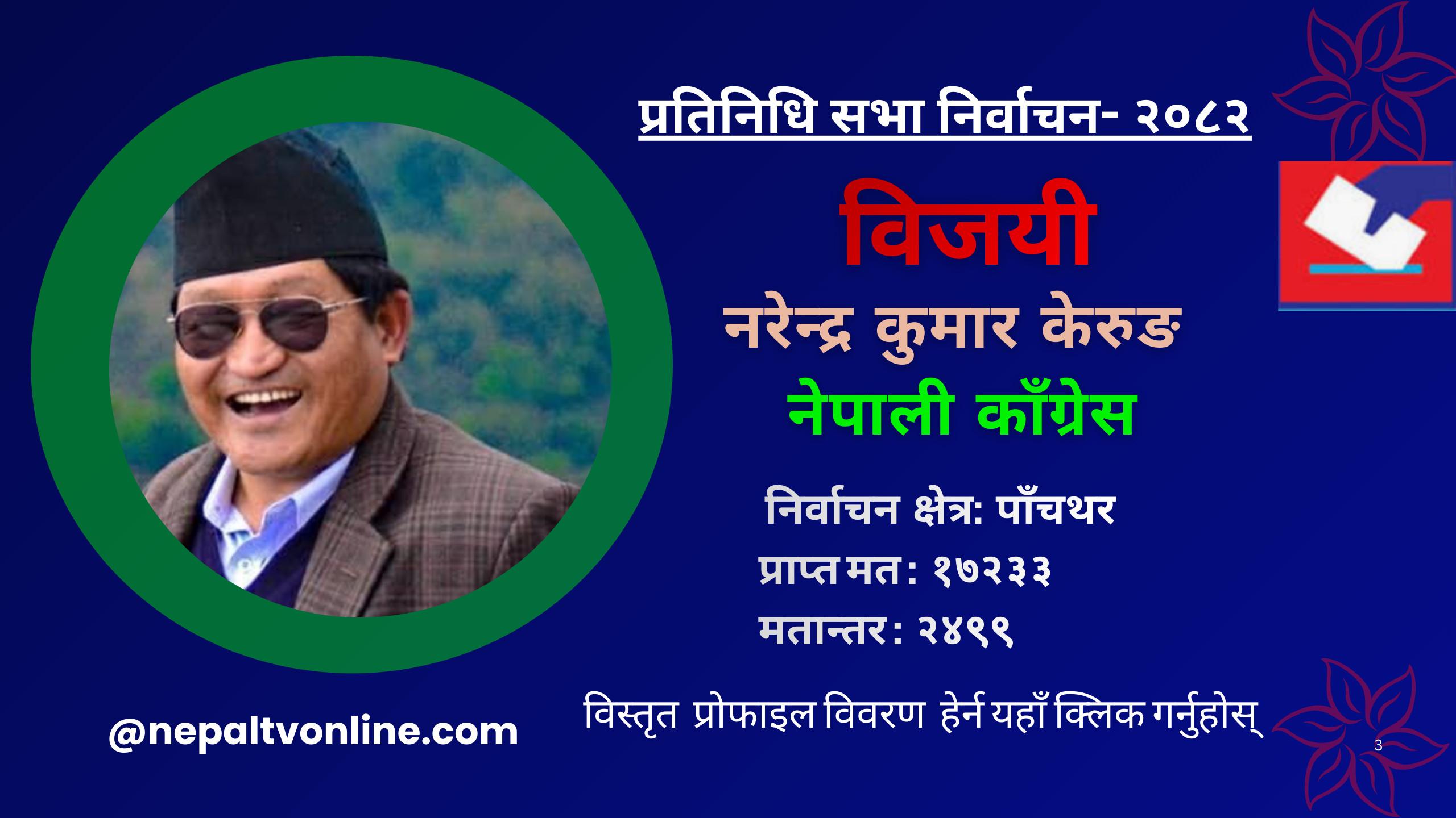 पाँचथर- पाँचथरबाट प्रतिनिधिसभा सदस्यमा नेपाली कांग्रेसका उम्मेदवार नरेन्द्रकुमार केरुङ विजयी हुनुभएको छ । आज सम्पन्न मतगणनाअनुसार उहाँ १७ हजार २३३ मत प्राप्त गर्दै प्रतिनिधिसभा सदस्यमा विजयी हुनुभएको हो । उहाँका निकटतम प्रतिस्पर्धी श्रम संस्कृति पार्टीका हस्तराज शेर्माले १४ हजार ७३४ मत प्राप्त गर्नुभयो । केरुङ श्रम संस्कृति पार्टीका शेर्माभन्दा दुई हजार ४९९ बढी मत प्राप्त गर्दै विजयी हुनुभएको हो ।