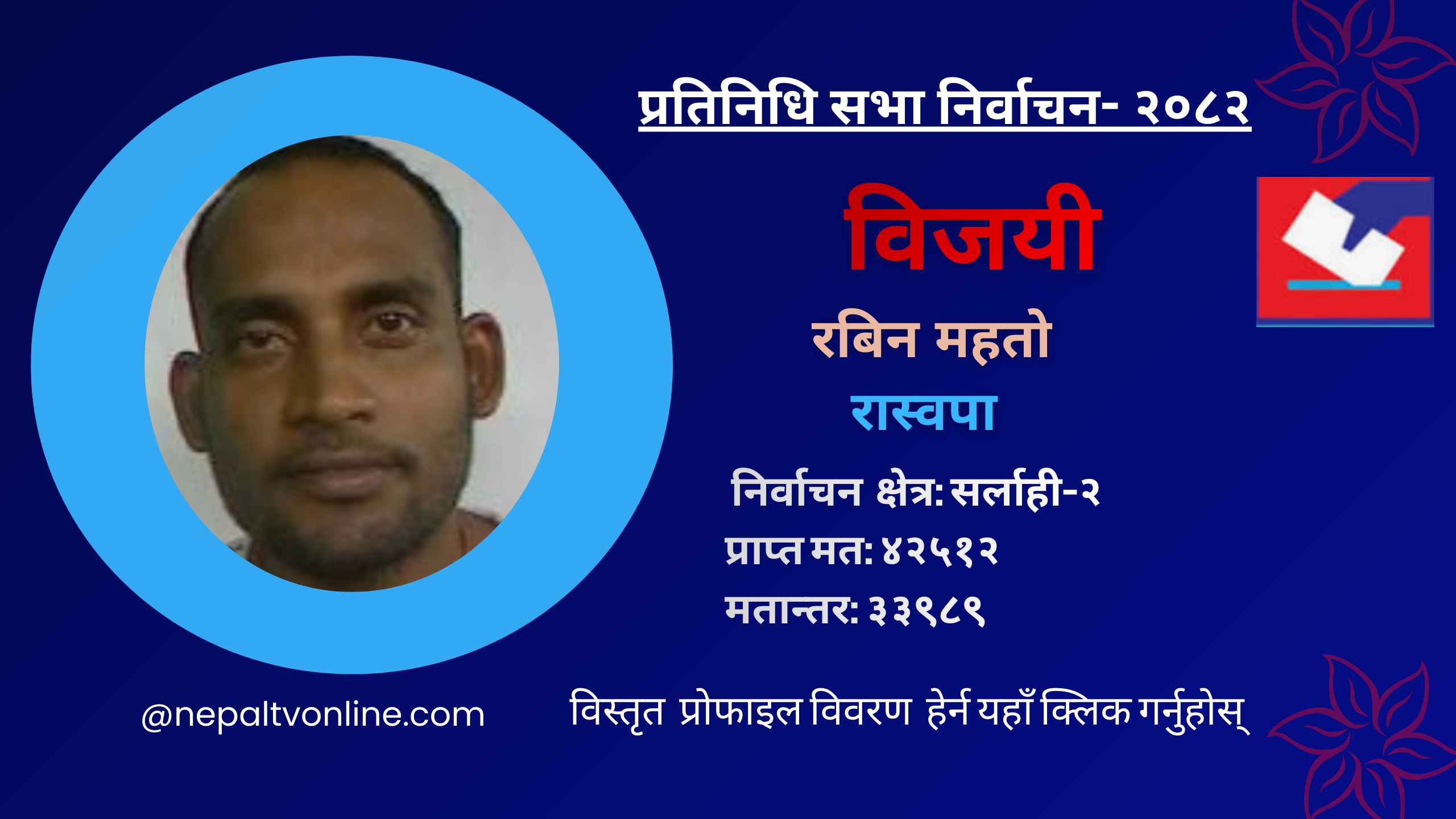 काठमाडौँ- प्रतिनिधि सभा निर्वाचन अन्तर्गत सर्लाही-२ बाट रबिन महतो विजयी हुनुभएको छ। उहाँले ४२५१२ मत प्राप्त गरी निर्वाचित हुनुभएको छ । उहाँका निकटतम् प्रतिद्वन्द्वी नेकपाका महिन्द्र राय यादवले ८५२३ मत प्राप्त गर्नुभएको छ।