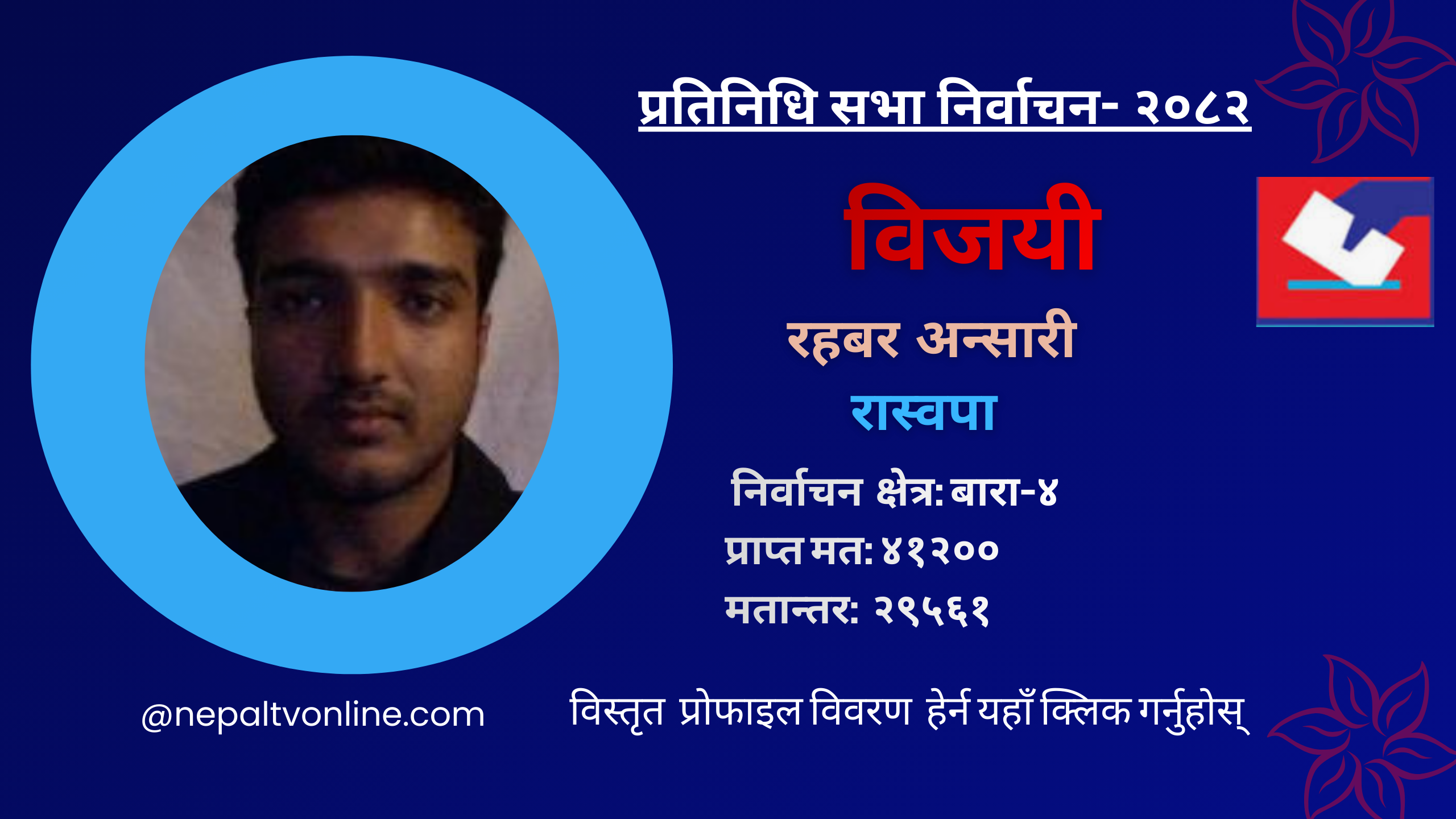 काठमाडौँ- बारा-४ बाट प्रतिनिधि सभा सदस्यका लागि रास्वपाका रहबर अन्सारी विजयी हुनुभएको छ । उहाँले ४१२०० मत ल्याउनुभएको छ । उहाँका निकटतम् प्रतिद्वन्द्वी नेकपा एमालेका कृष्णकुमार श्रेष्ठले ११६३९ मत प्राप्त गर्नुभएको छ ।